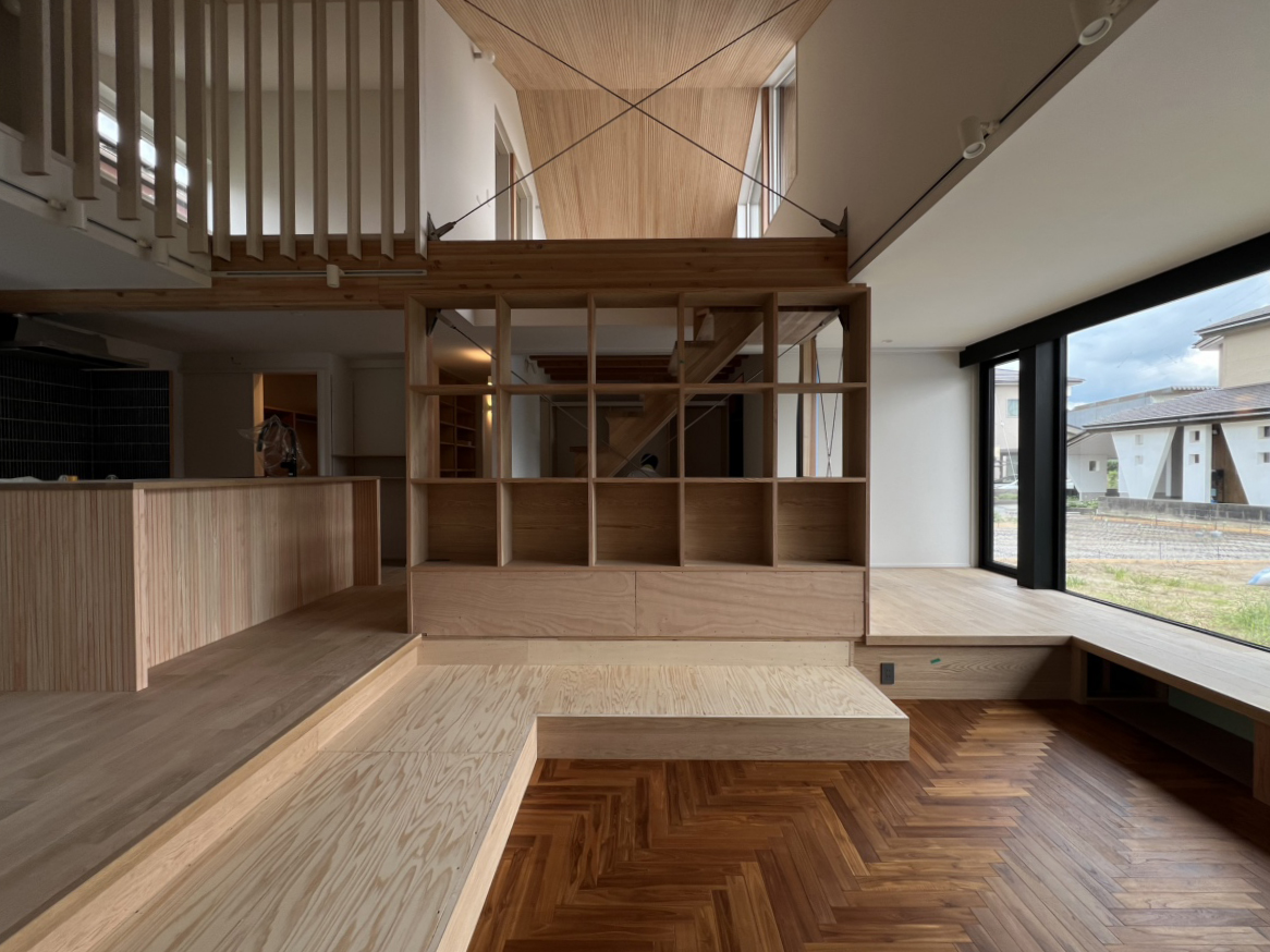 床座で過ごす心地よさを大切にし、ヘリンボーンの床やL字ベンチが多彩な居場所をつくります。