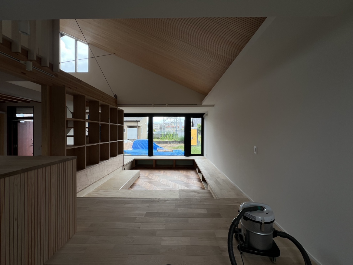 床座リビングの居心地、勾配天井の抜け感、木の質感が醸す安らぎ、