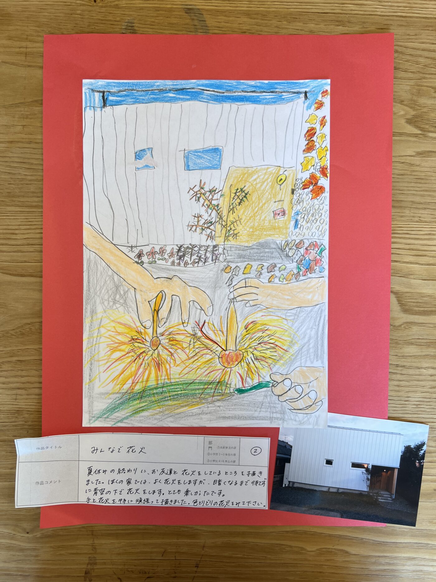 夏休みの終わりに、お友達と花火をしているところを描きました。ぼくの家ではよく花火をしますが、暗くなるまで待てずに青空の下で花火をします。とても楽しかったです。手と花火を特に頑張って描きました。色とりどりの花火をみてください。