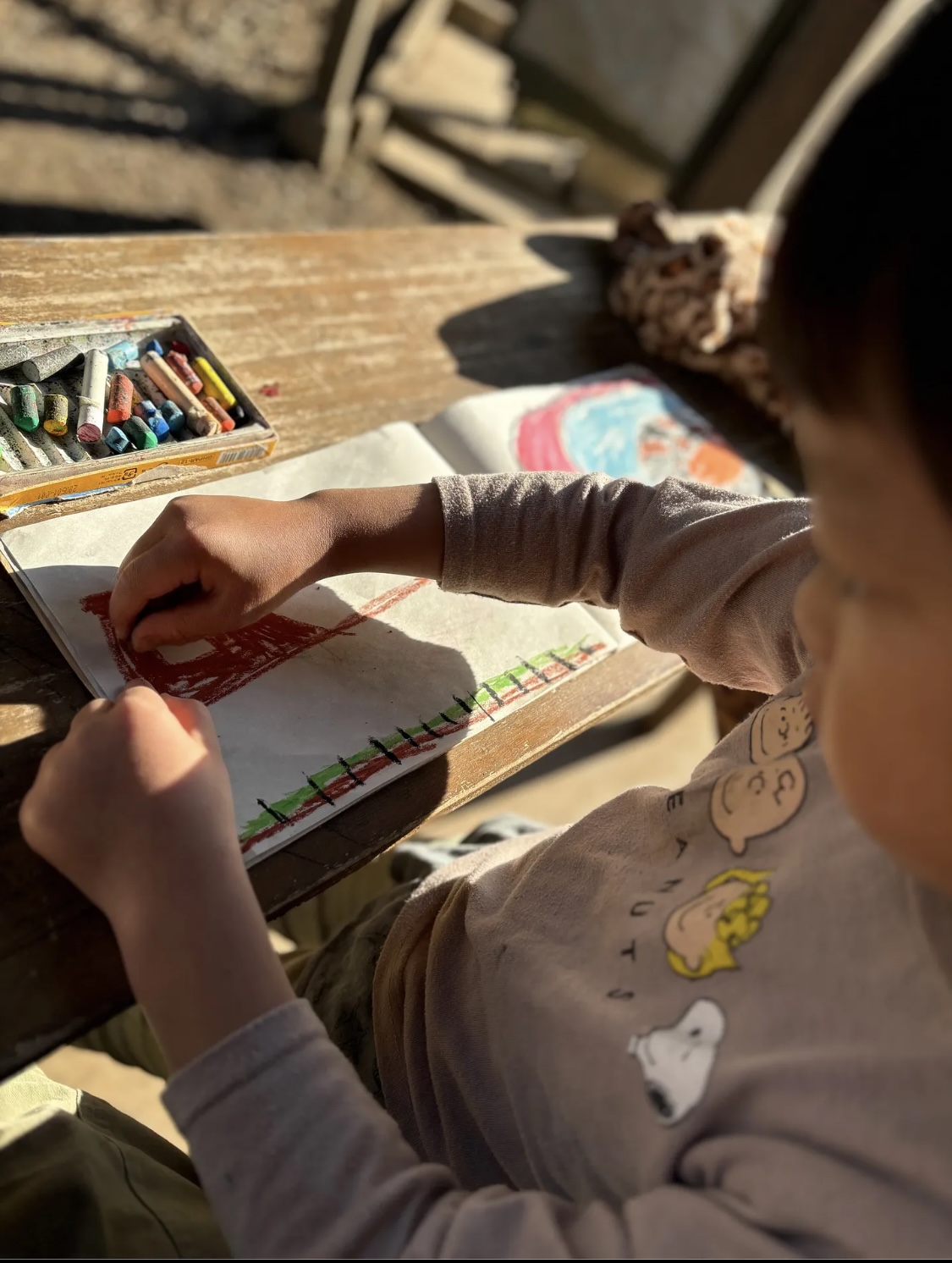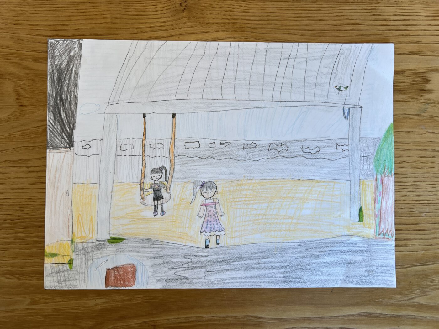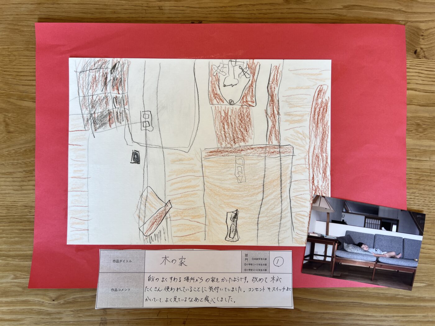 自分のよくすわる場所からの家を描いたようです。改めて木がたくさん使われていることに気付いていました。コンセントやスイッチまで描いていて、よく見ているなあと感心しました。