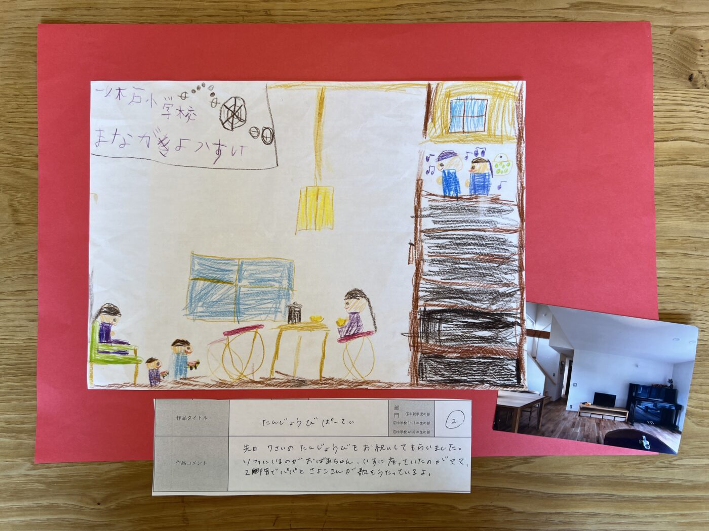 先日7さいのたんじょうびをお祝いしてもらいました。ソファにいるのがおばあちゃん、いすに座っていたのがママ、2階でパパとさよこさんが歌をうたっているよ。