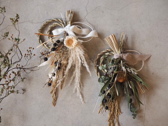 お好きな花材を組み合わせて、しめ縄飾りをつくりましょう。
