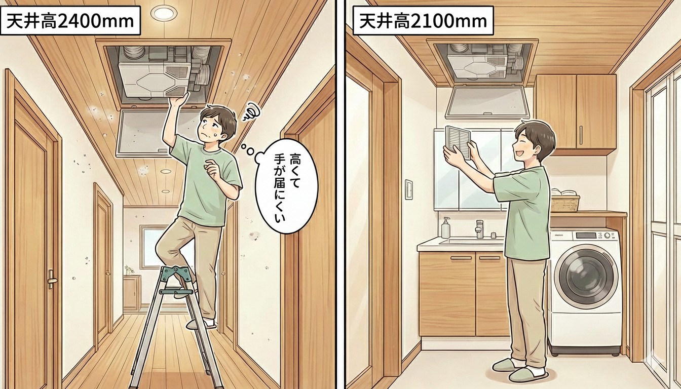 脱衣室など、天井を2100mm程度に低くしたスペース