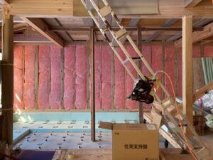 断熱気密施工中です。 断熱構成 基礎断熱 外周部立上り・底版敷込 EXP100㎜ 外周部壁断熱 付加断熱EXP50㎜+内部充填HGW105㎜ 屋根天井断熱 セルロース吹き込み 300㎜ 天井の断熱吹き込み施工を残して、断 … 続きを読む 「豊町の家」断熱気密工事