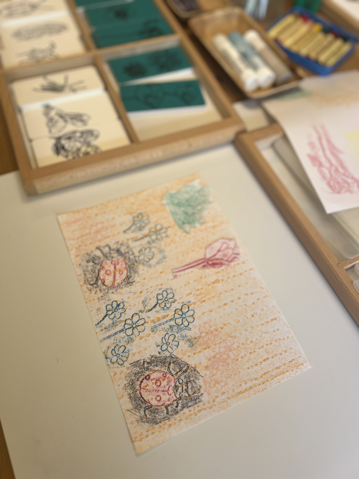 花や虫の絵を、クレヨンなどでこすり出して、自由に組み合わせます。
