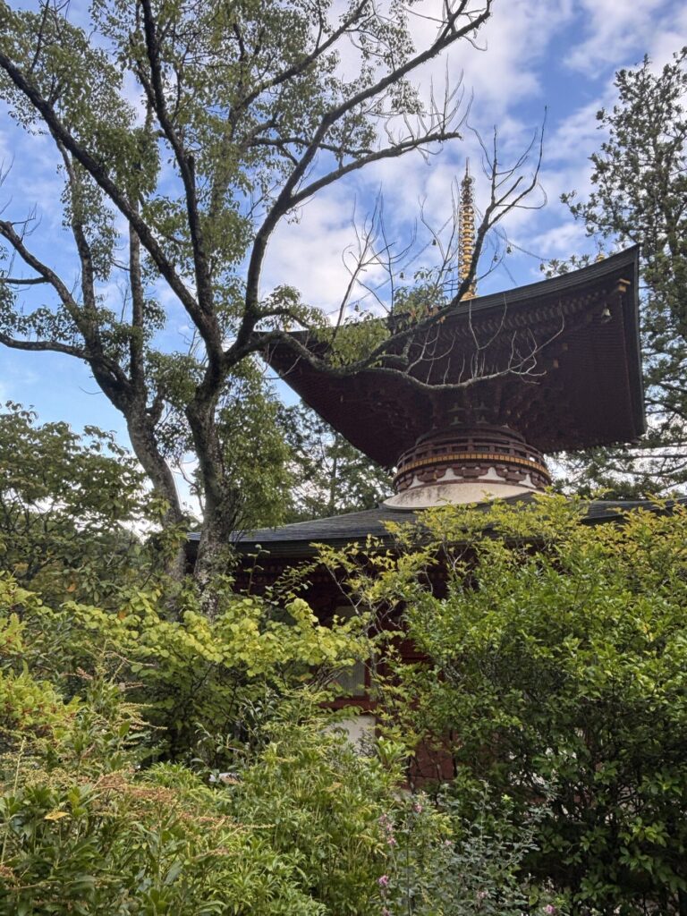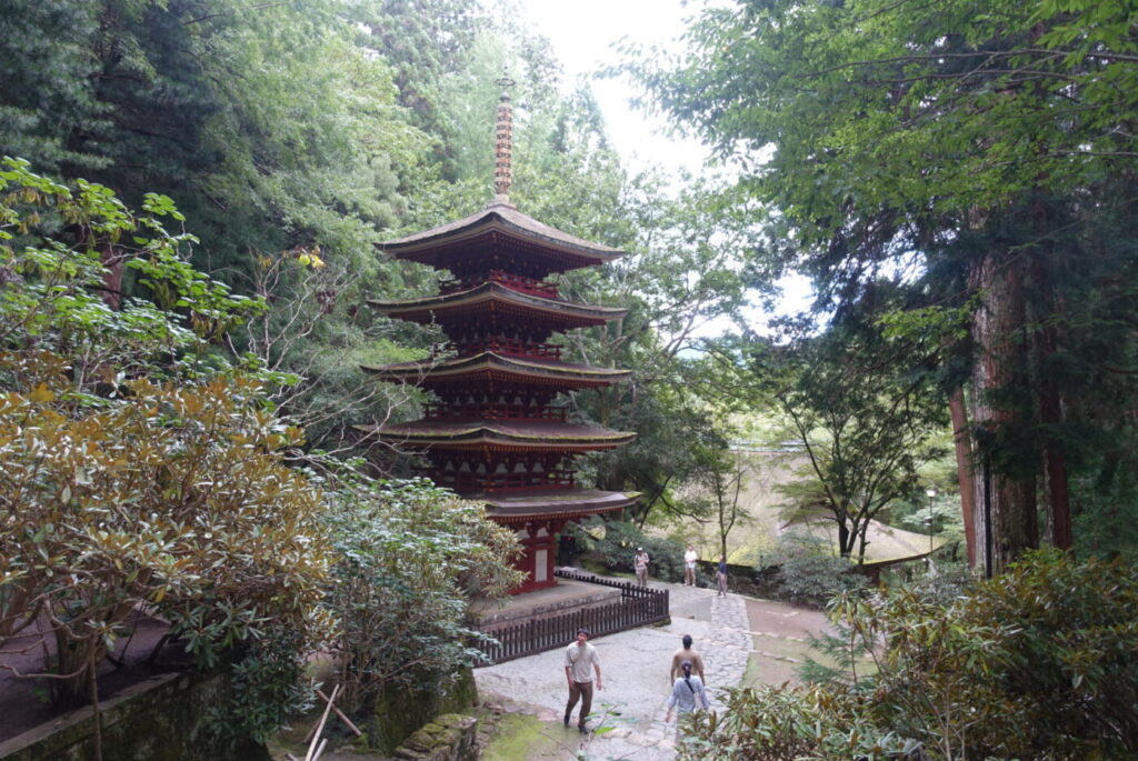 境内には日本で最も小さな五重塔があり、その姿は繊細で美しく、山の緑に映えていました。