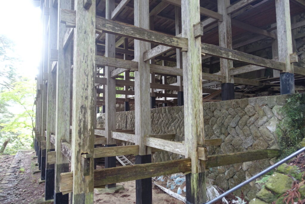 がけ地に建つ奥の院は懸造りによって支えられています。