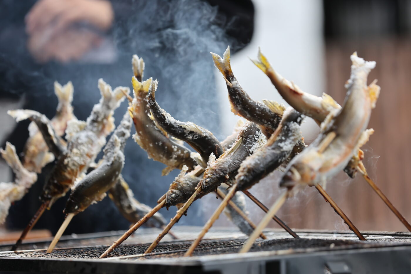 大工ながら釣りもプロ級の佐久間さんの鮎の塩焼きときのこ汁。