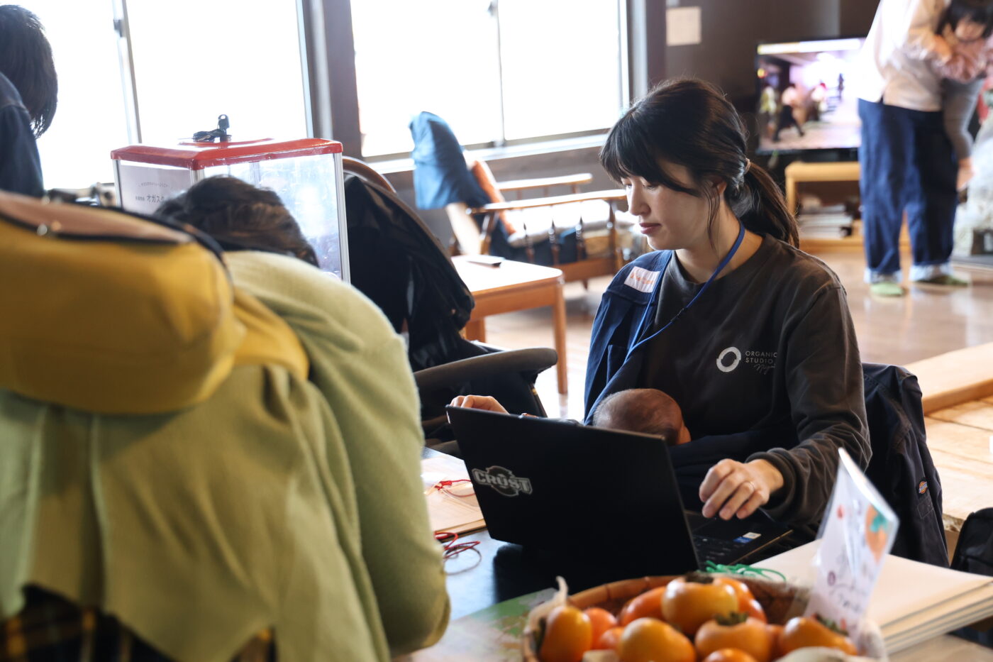 育休中のはずの大越さんが、生後2か月の赤ちゃんを抱っこしながら