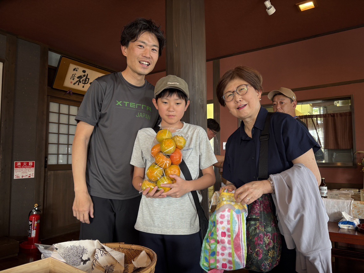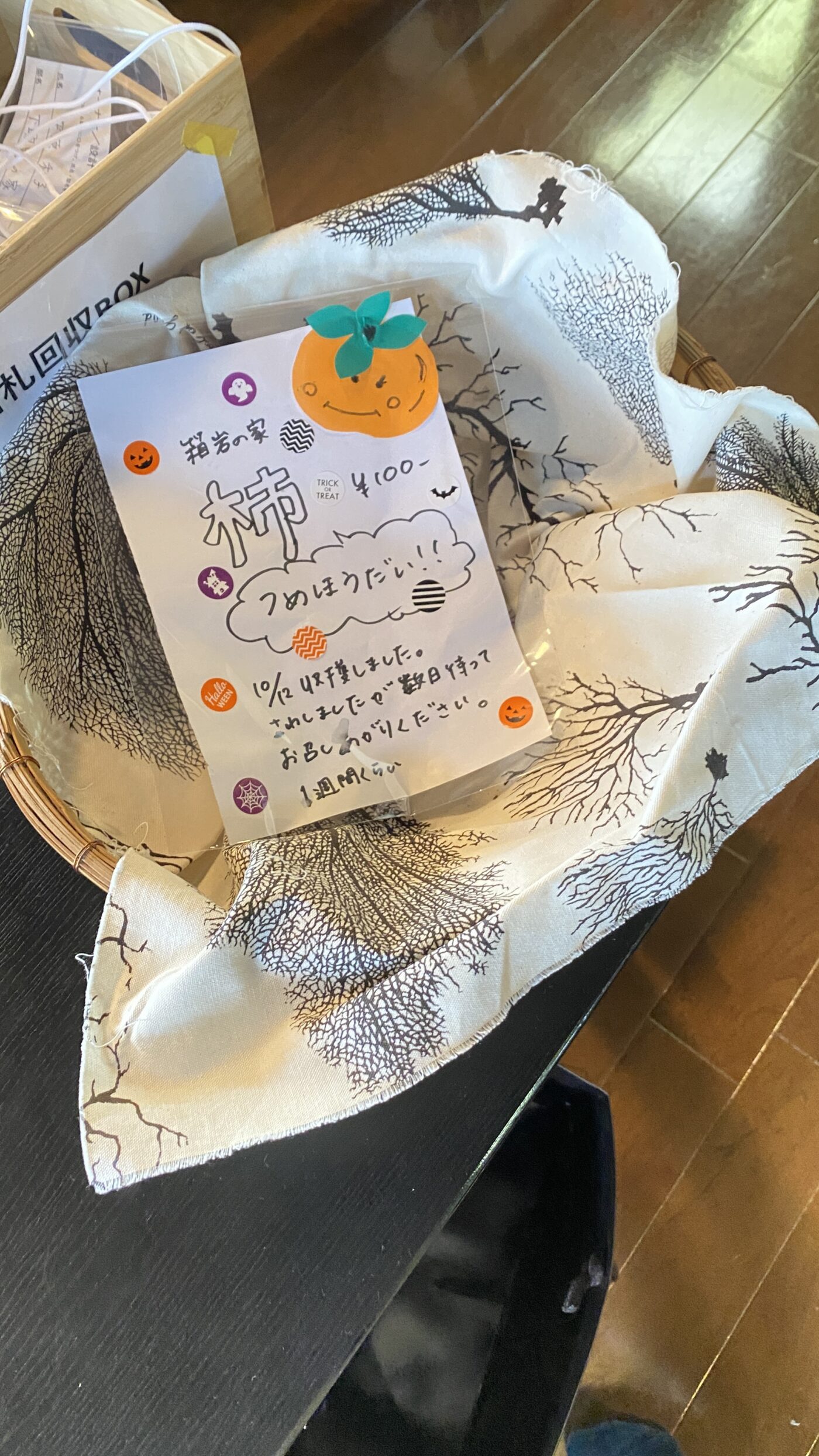 受付には、麻衣子さんご実家・箱岩の家で獲れた柿が破格の詰め放題が!