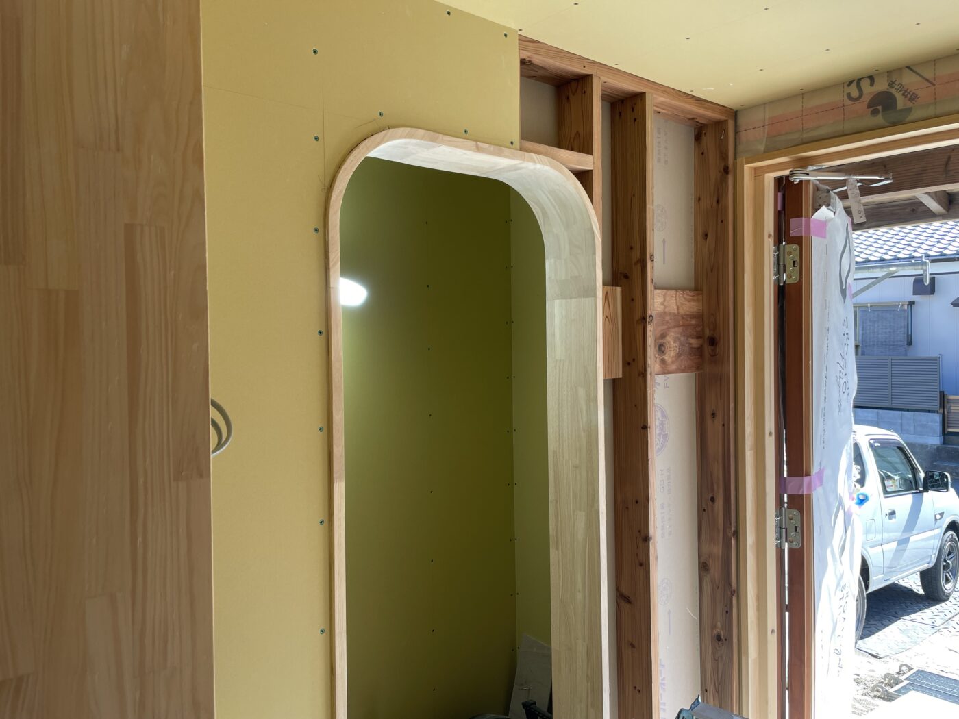 このあと吹き抜け側の開口部には、採風用の建具と防音用のベニヤ引き違い戸が建て付けられます。