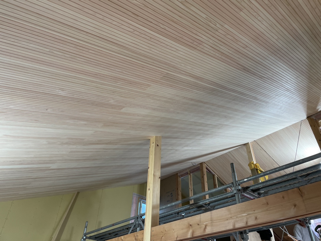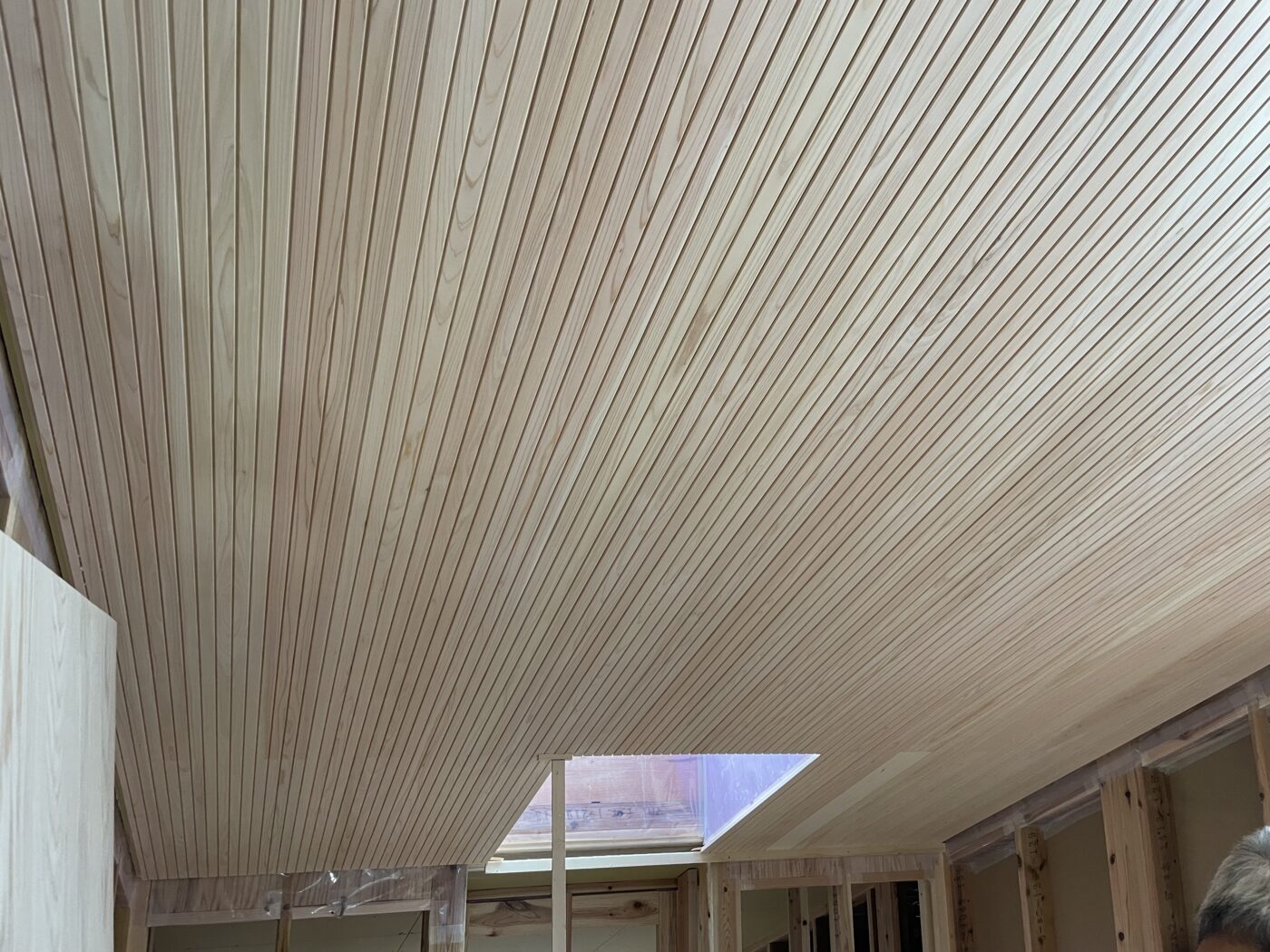オガスタでは定番の天井仕上材である「小幅板風羽目板」。