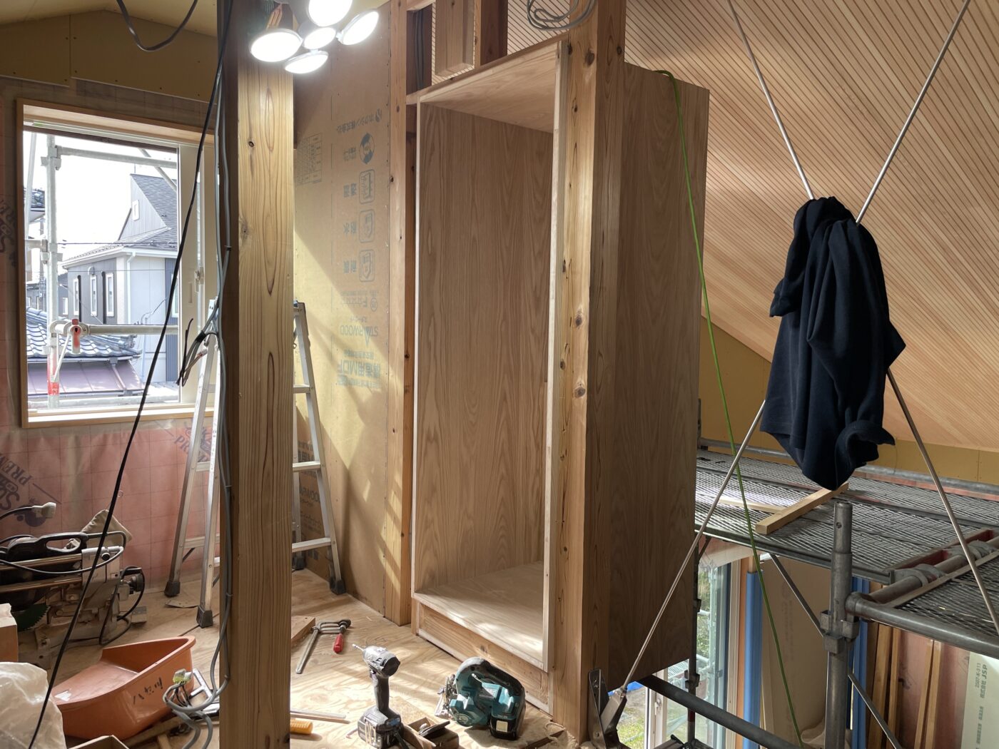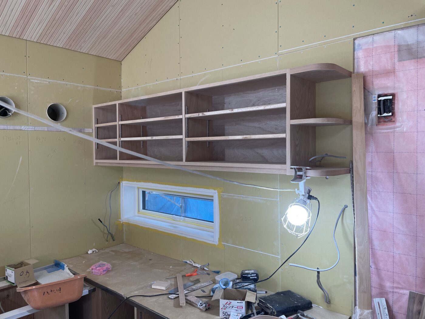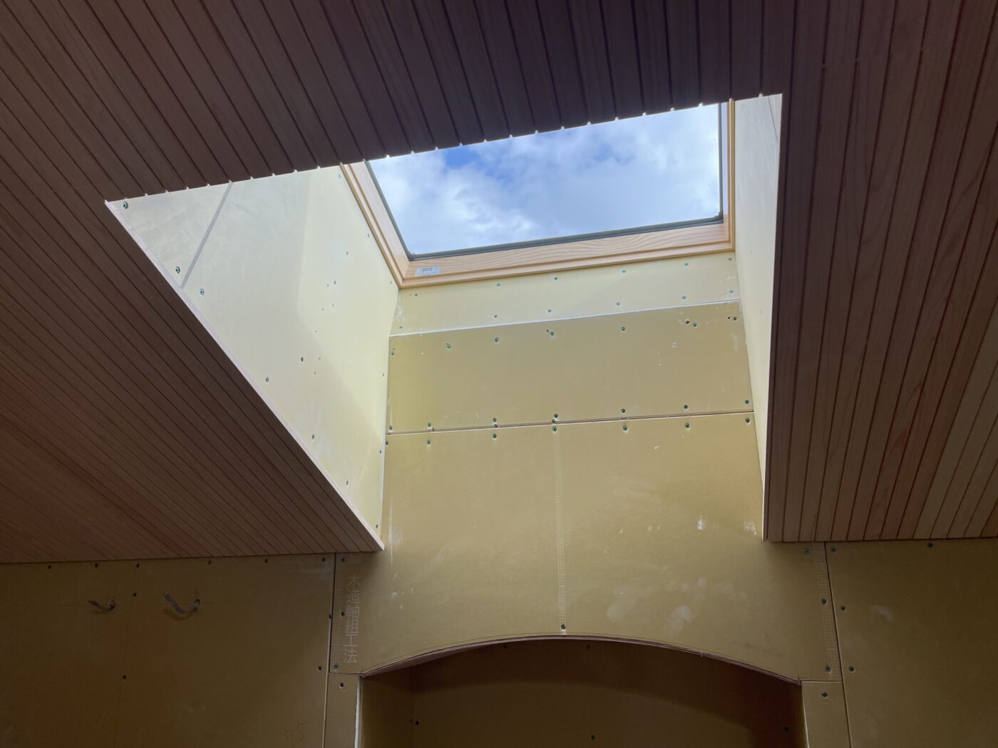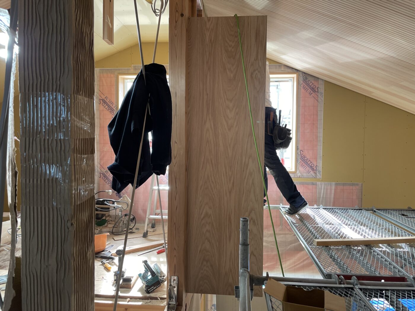 このあと吹き抜け側の開口部には、採風用の建具と防音用のベニヤ引き違い戸が建て付けられます。