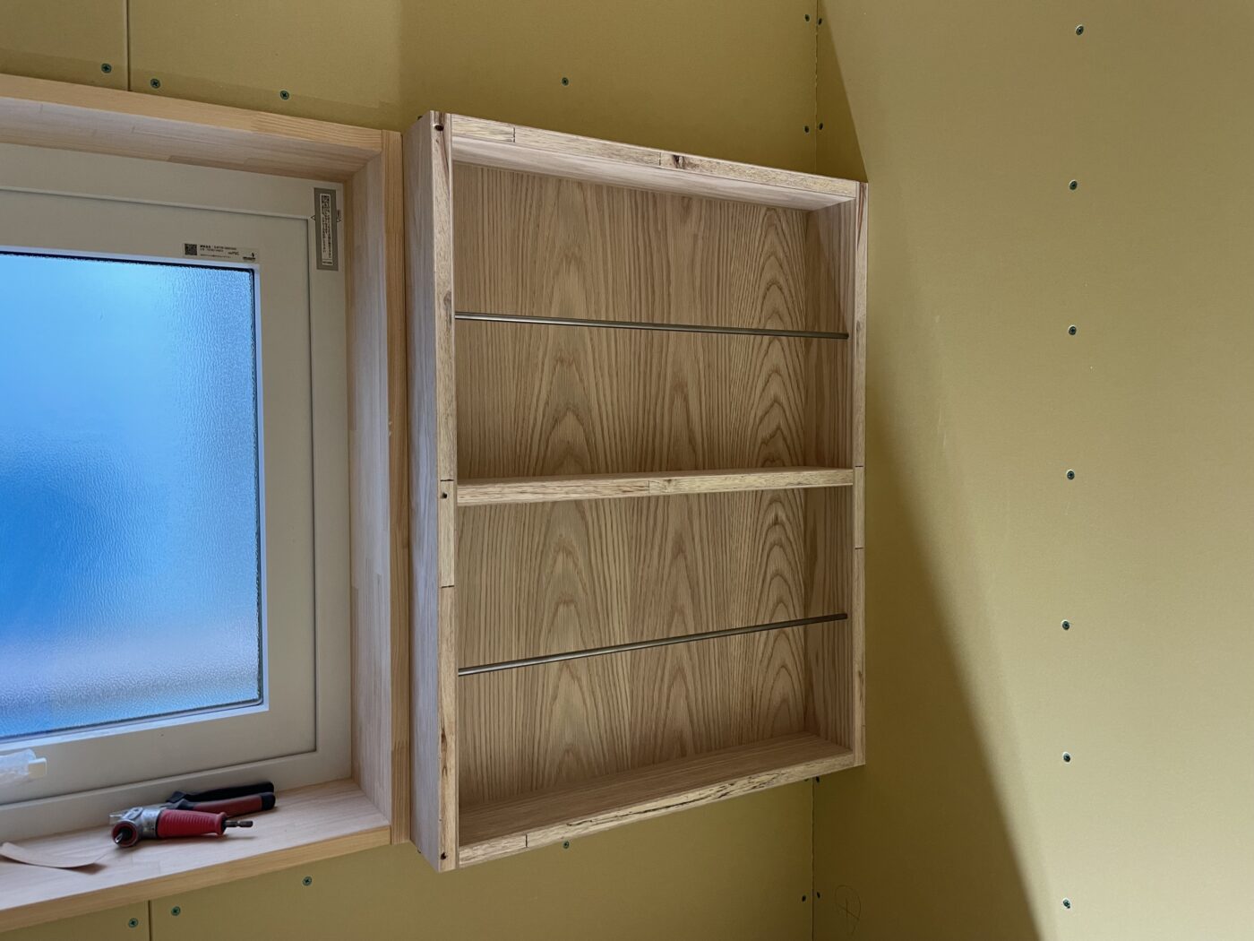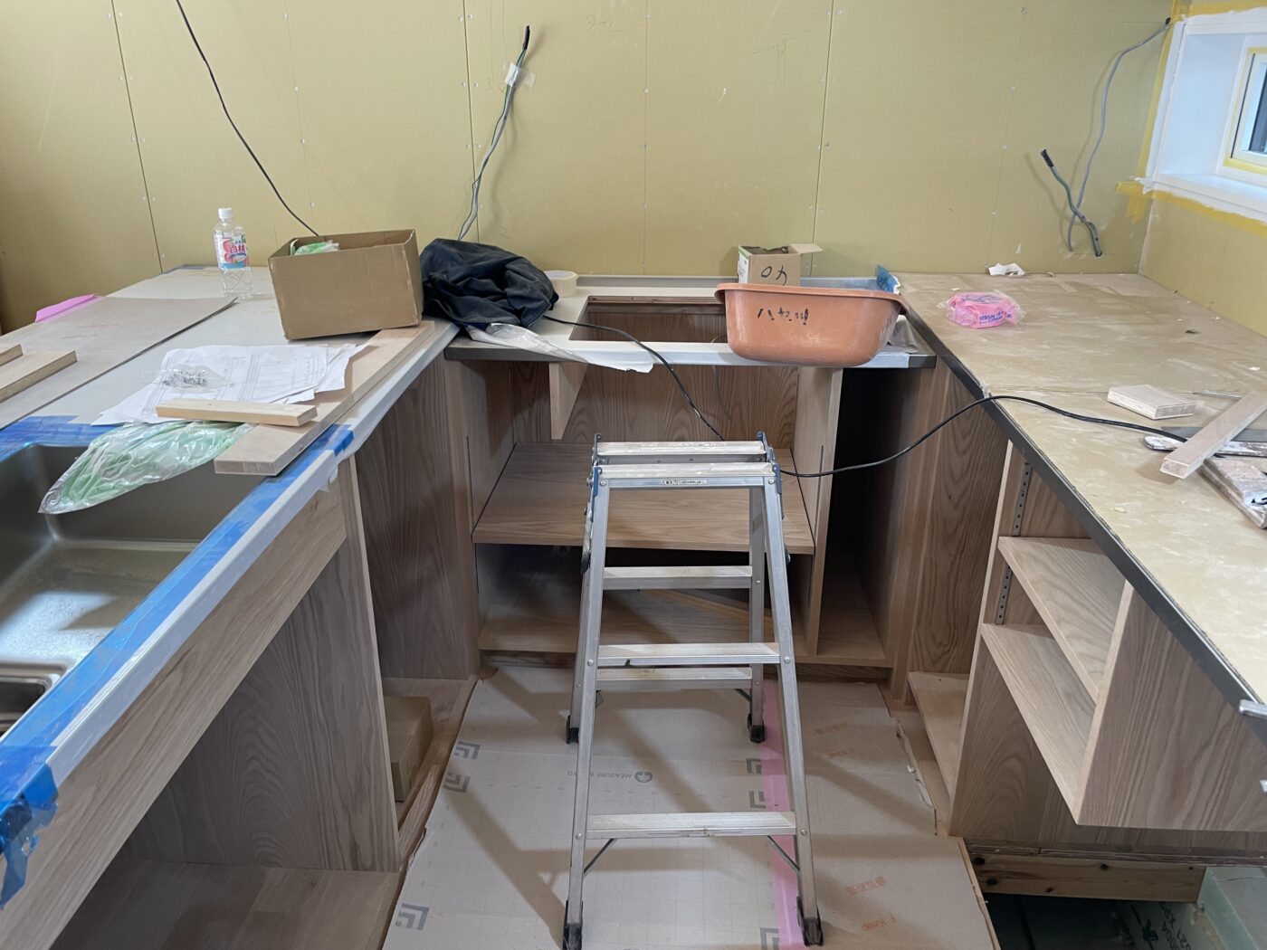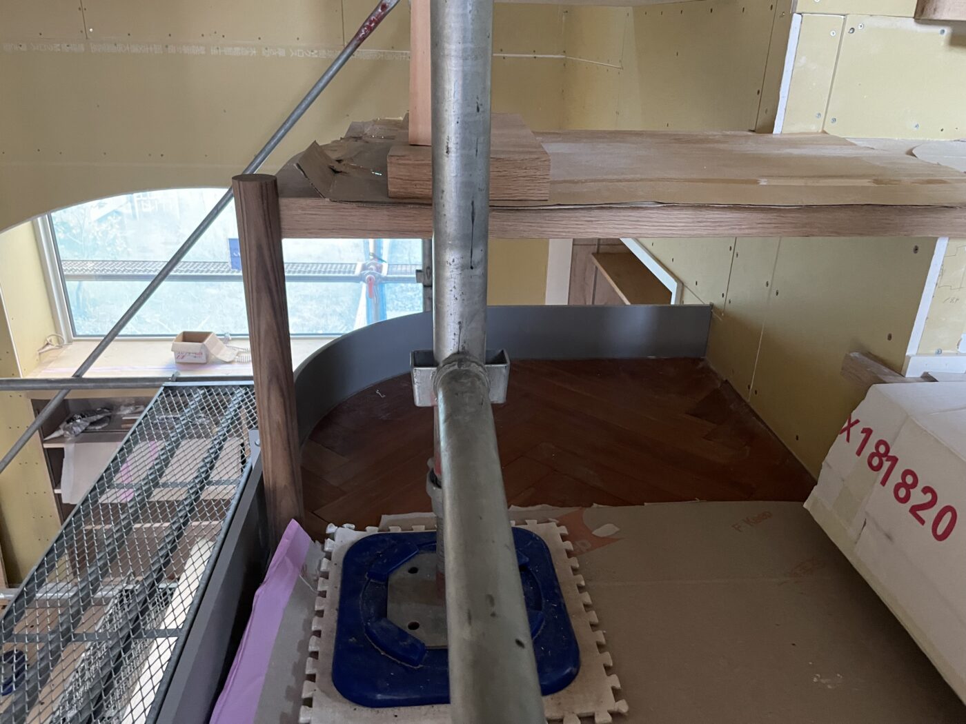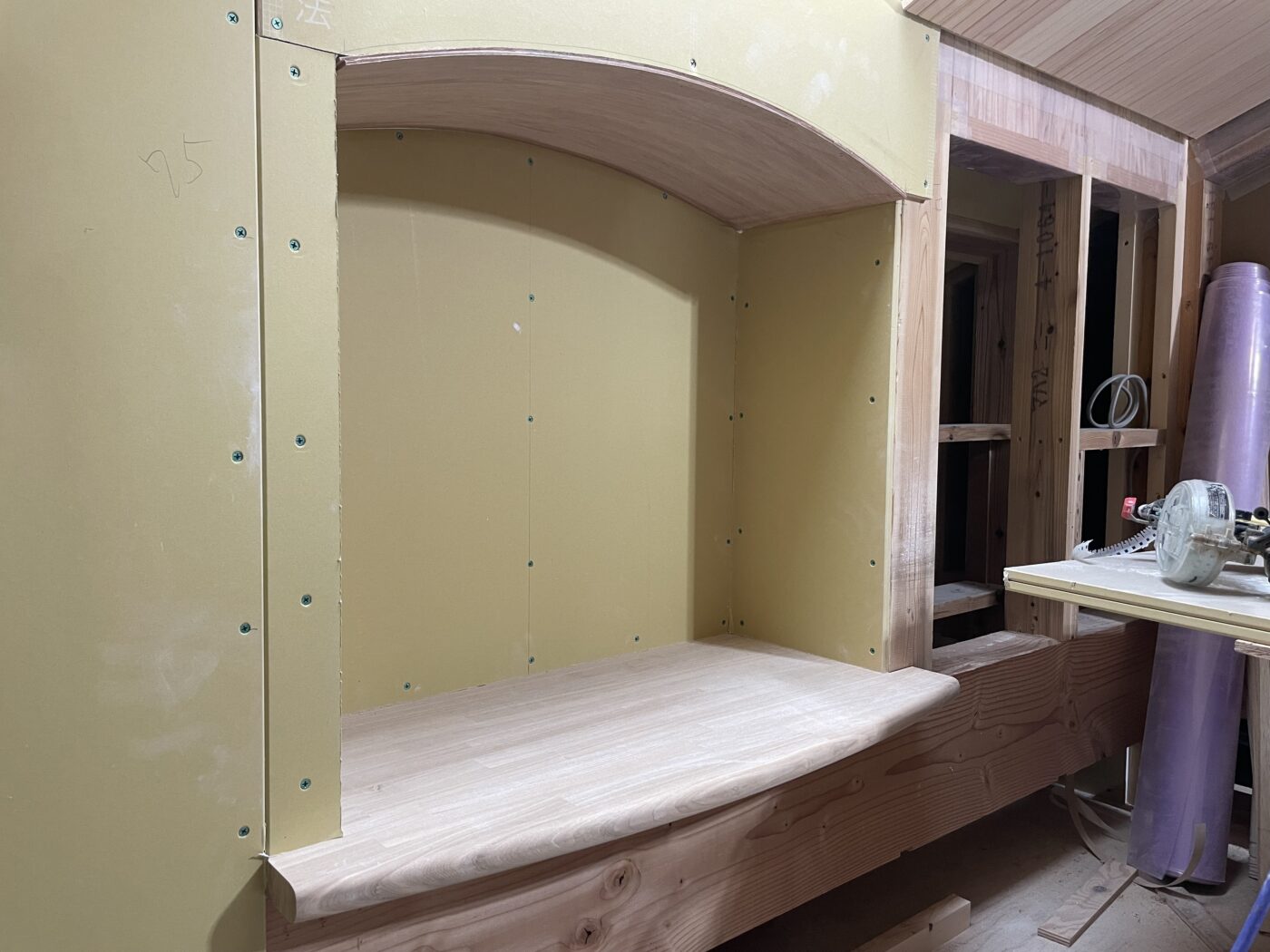 このあと吹き抜け側の開口部には、採風用の建具と防音用のベニヤ引き違い戸が建て付けられます。