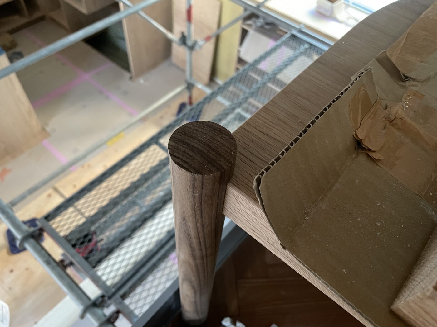 踊り場にはベンチとなる板を設置し、角が隠れるよう同じくチーク材の丸棒ではね出し部を支えております。