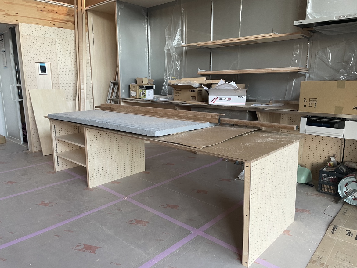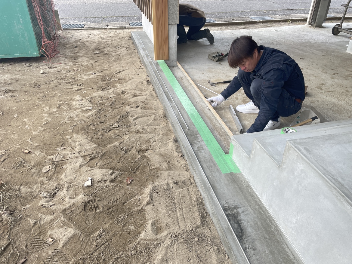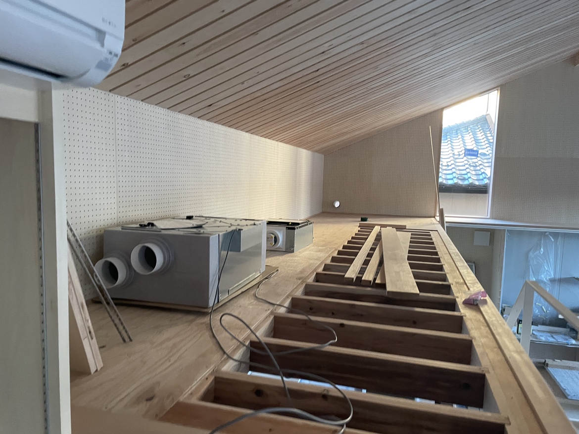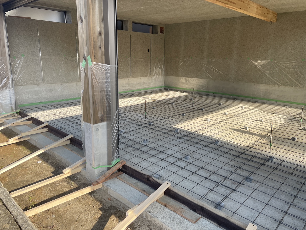 シャッターが設置され、ガレージ内の土間コンクリートの準備中。
