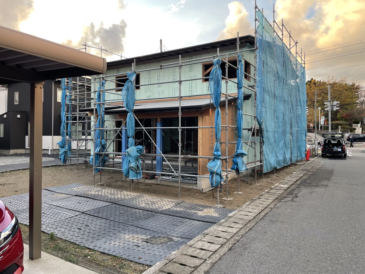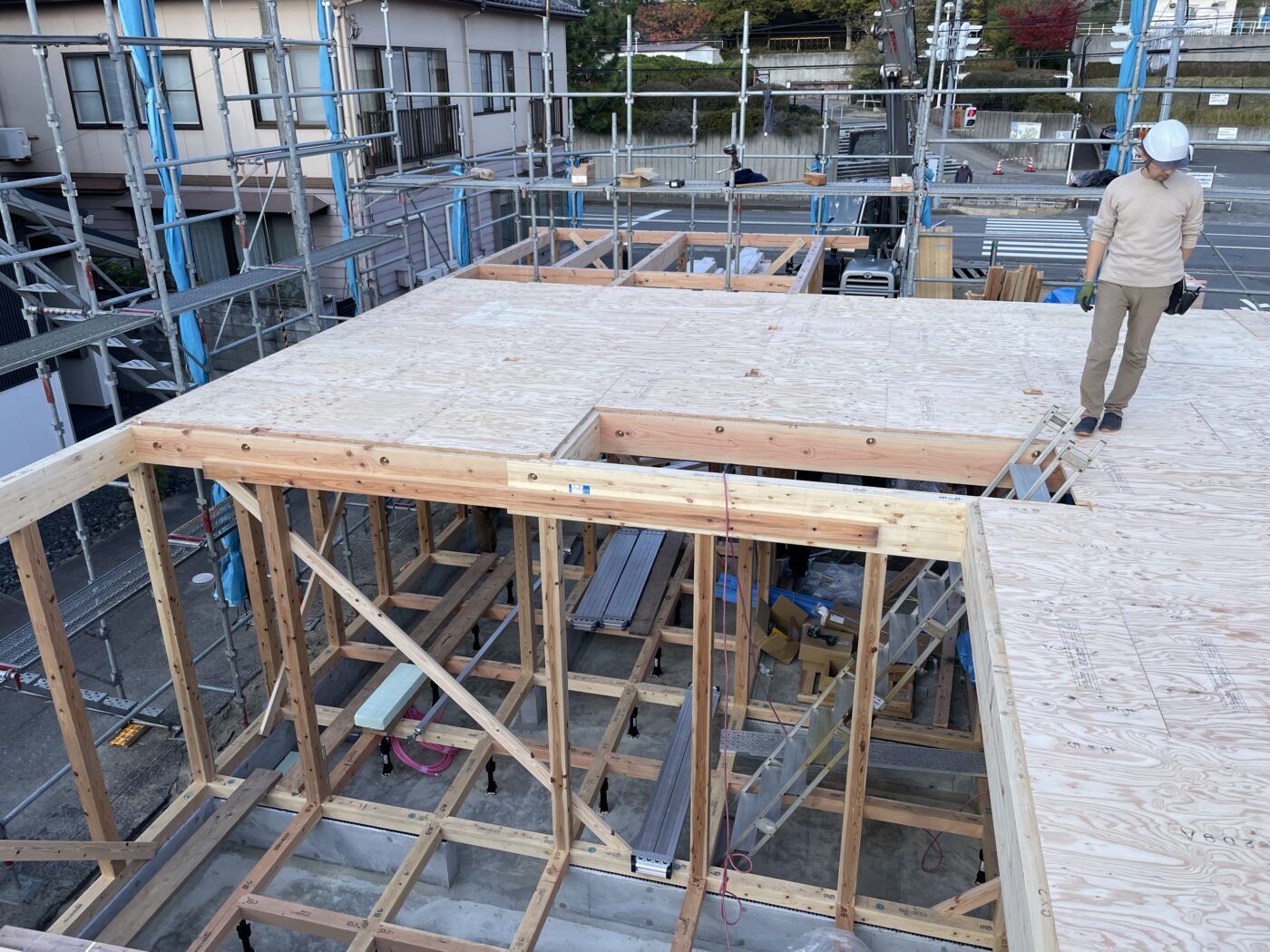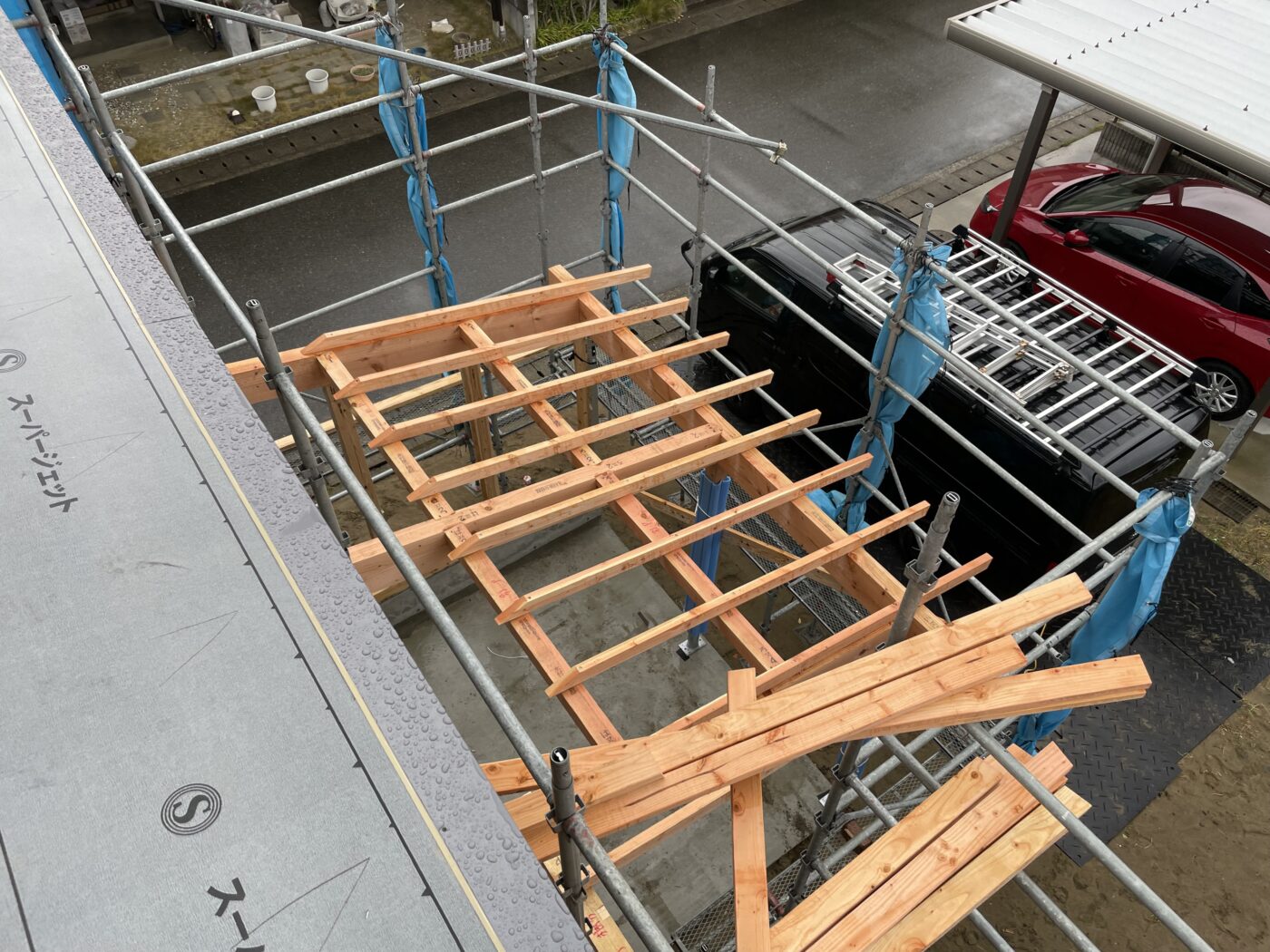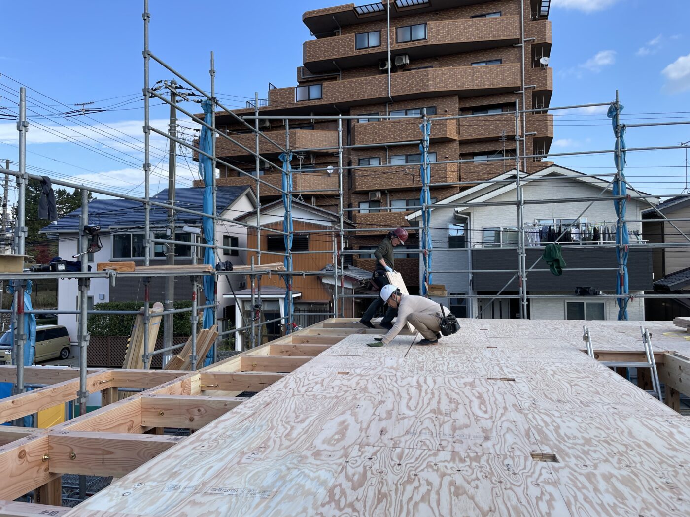 一時雨が降る場面もありましたが、無事故かつ順調に上棟、その後屋根防水まで完了いたしました。