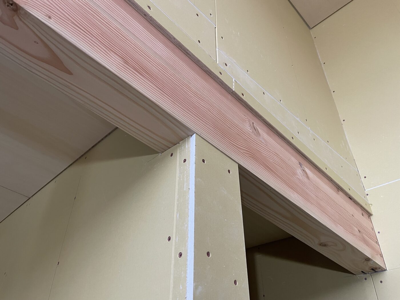 こちらの化粧梁は、梁下では梁とクロスをほぼ同面で仕上げ、梁上はクロスを巻き込むという納まり。