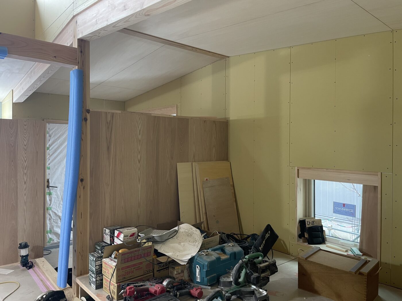 内部の断熱気密工事が完了し、現在は造作工事を進めております。