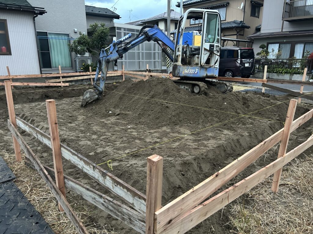 地盤調査の結果、改良工事は不要でしたのでさっそく基礎工事が始まりました。