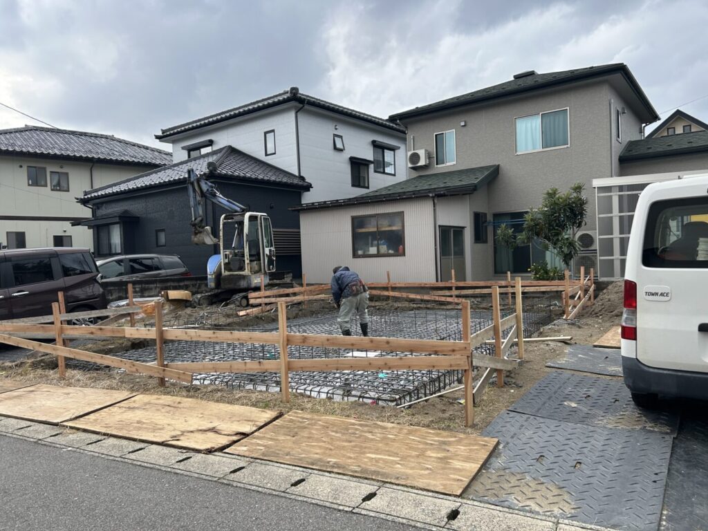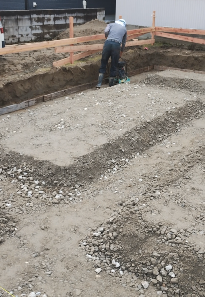 写真を撮り忘れてしまいましたが、転圧後は地面からの湿気を防ぐ防湿シートの処理を行い、捨てコンクリートという下地処理を行います。