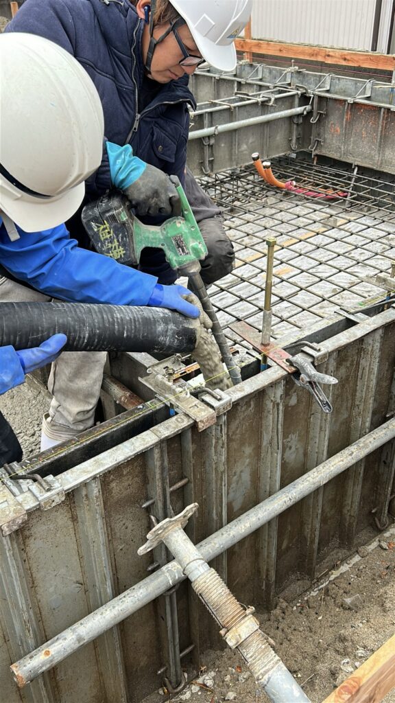 コンクリートを流れやすくするため、振動を与えながら丁寧に打ち込んでいきます。