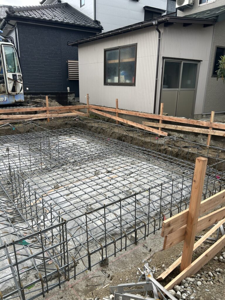 写真を撮り忘れてしまいましたが、転圧後は地面からの湿気を防ぐ防湿シートの処理を行い、捨てコンクリートという下地処理を行います。