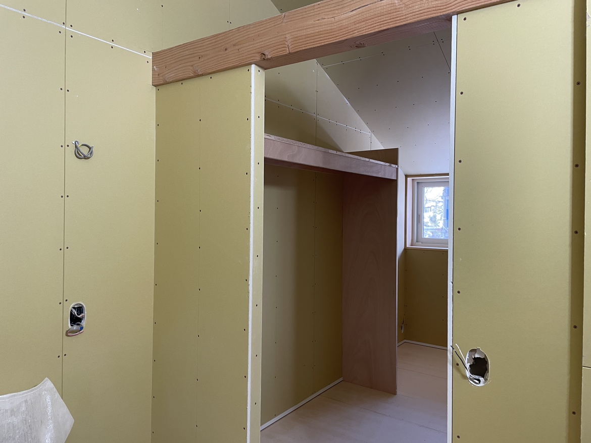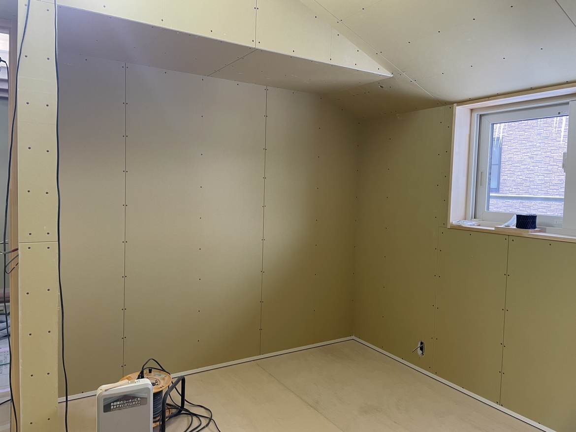 2階はボード貼りが終わり、巾木も取り付きました!