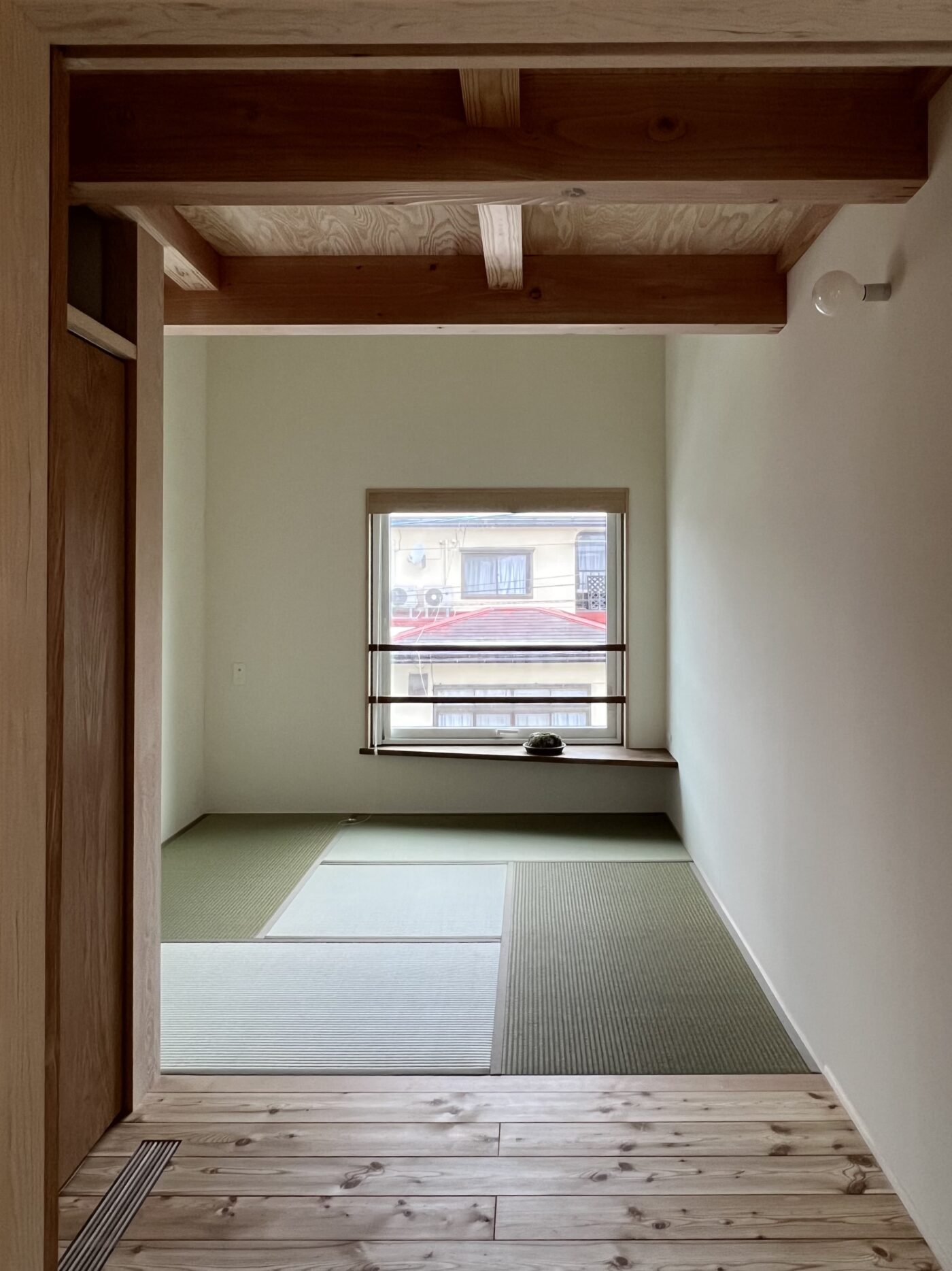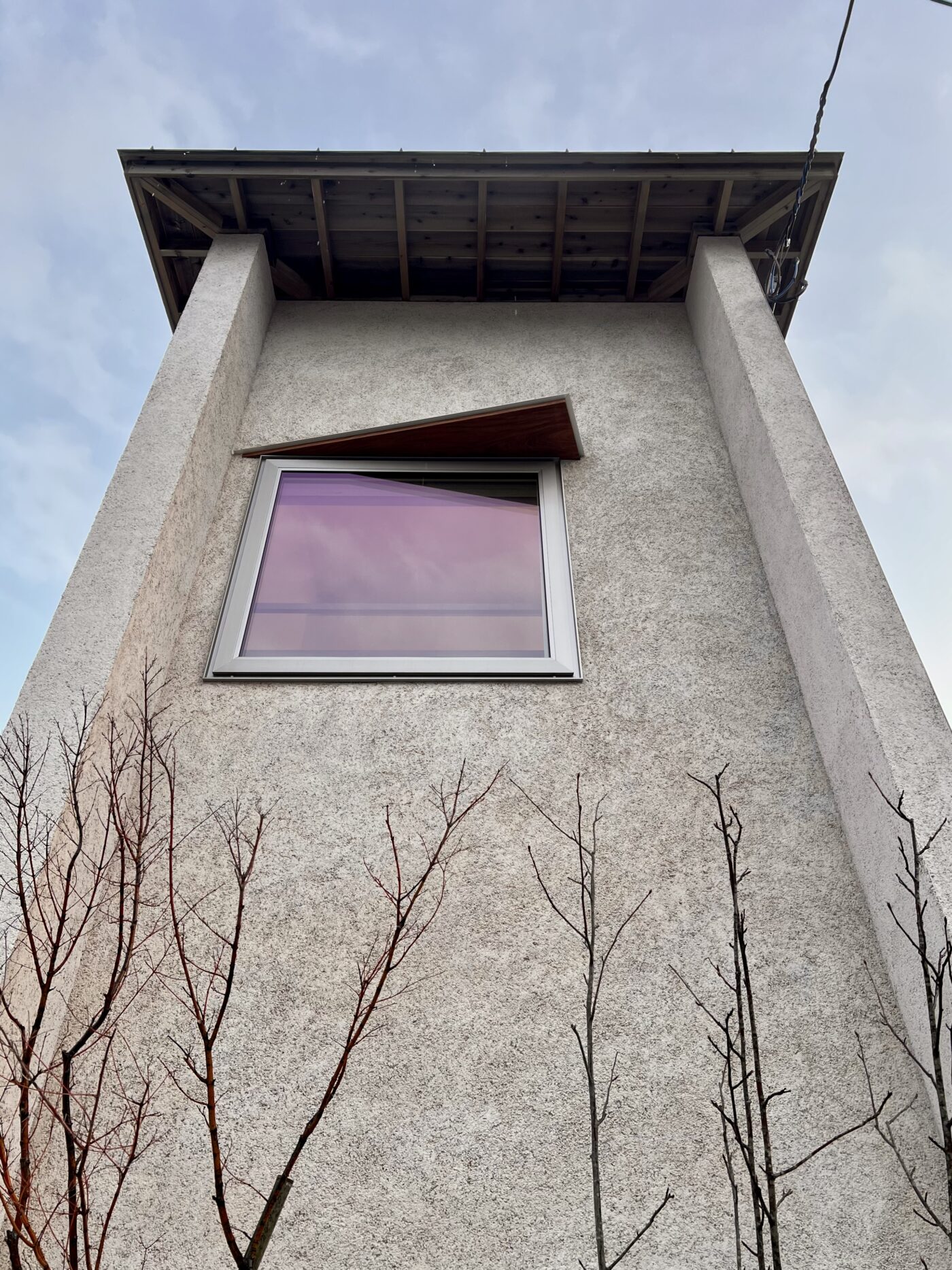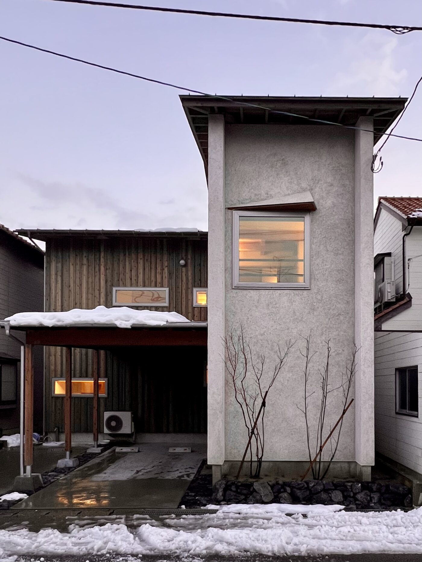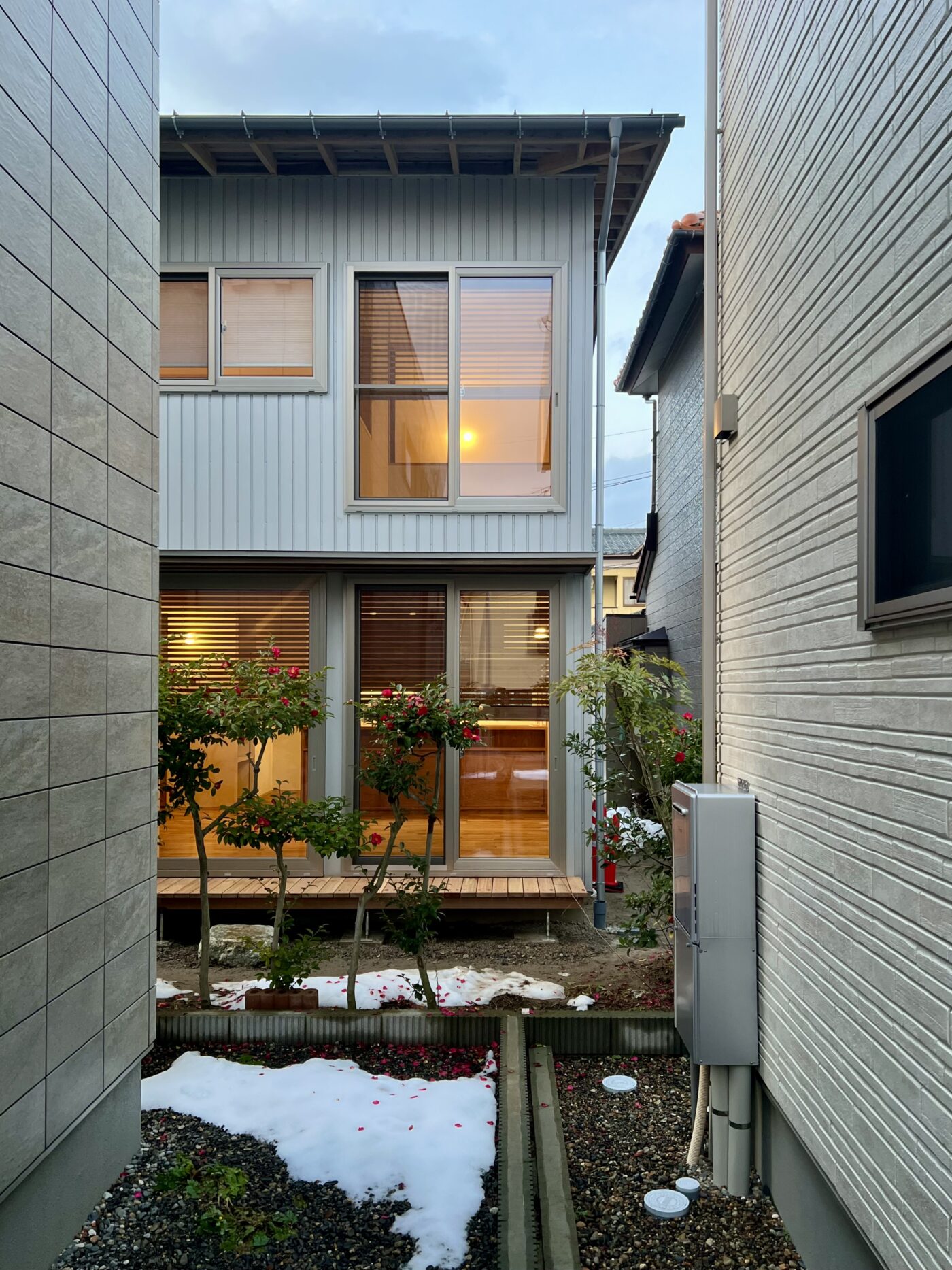 この家は、施主の「北極星が見たい」という何となくの言葉から設計が始まりました。新潟市中央区の住宅が密集する街中で、三方を隣家に囲まれ、庭が十分に確保できない敷地でしたが、南側には敷地境界周辺に偶然生まれる、都市的な魅力ある「隙間」や「空地」を手掛かりに、「冬の日射」、5月と10月の「自然通風」、地面から空まで縦長に切り取る街区の「風景」を獲得しました。また北側には北極星とつながる場を設えました。これらの要素は、自分の家にとっての私有ということだけでなく、街に開いて共有されることで、街並みと緩やかに関係が結ばれることを試みています。