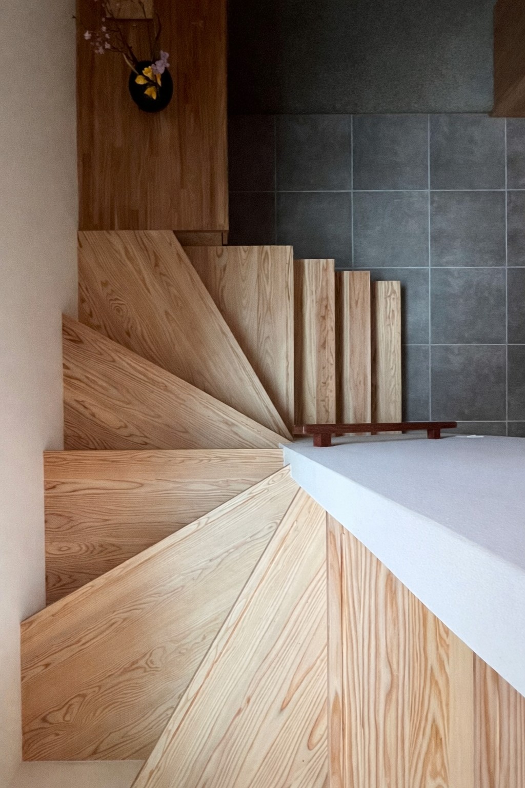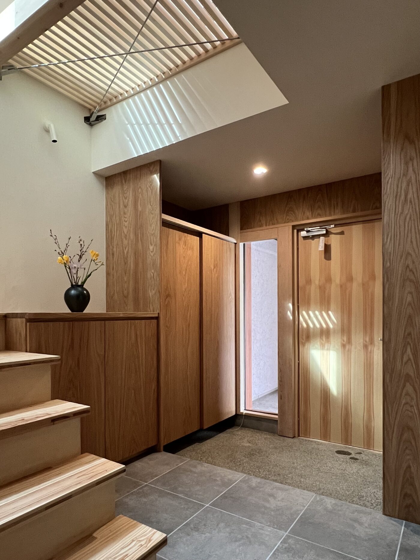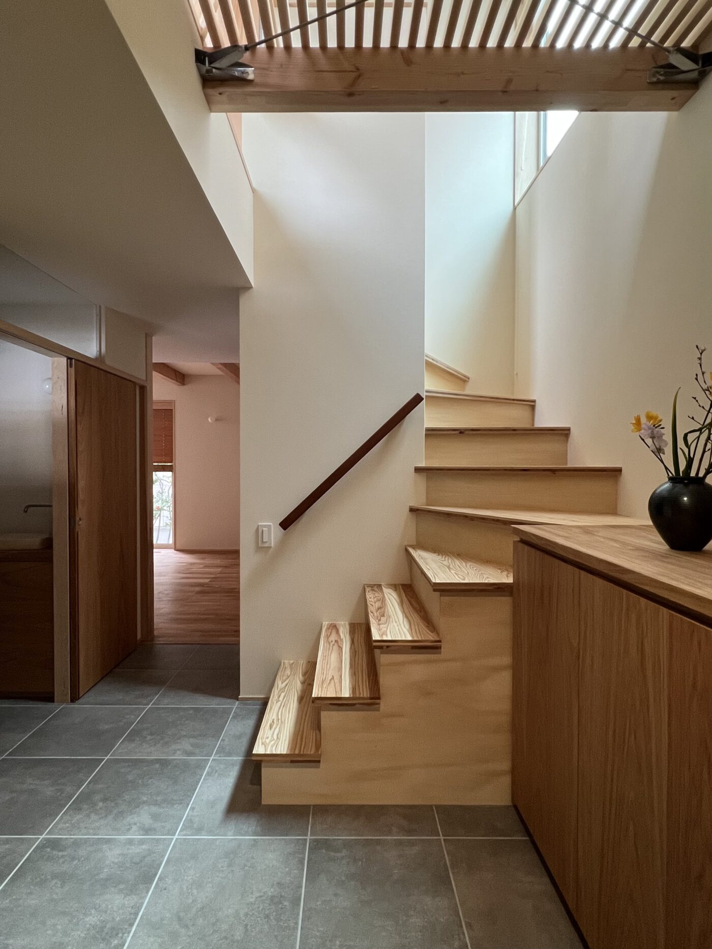 階段の手すりは、建替え前の和室の床柱として使っていたモノを、解体時に救出・加工して再生。