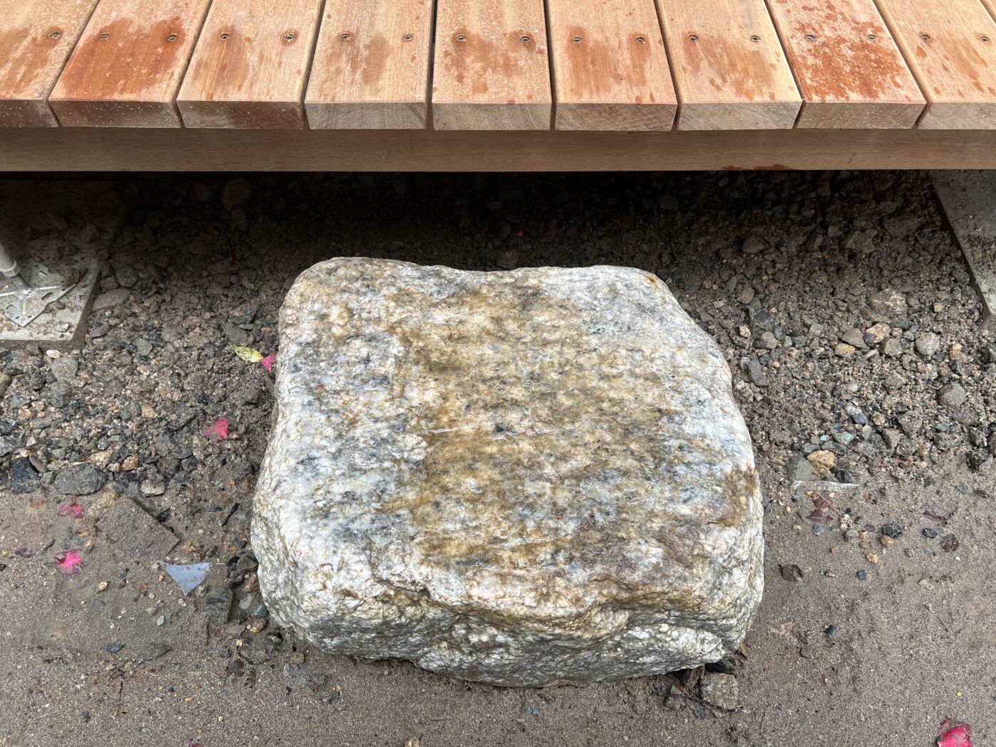 ヒスイの原石と信じている鉱石。施主が若い頃に自ら糸魚川の姫川で拾って大切に保管しておいたものを踏み石として再生。重すぎて持てません。