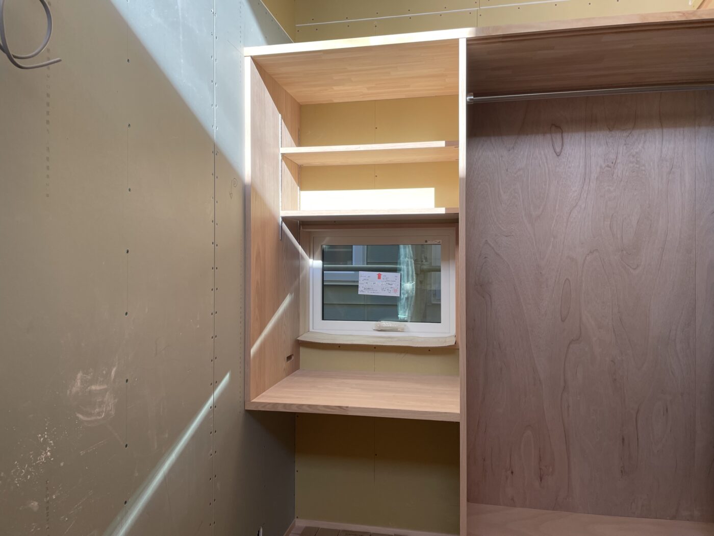 寝室の収納とカウンターは横一列に一体化。