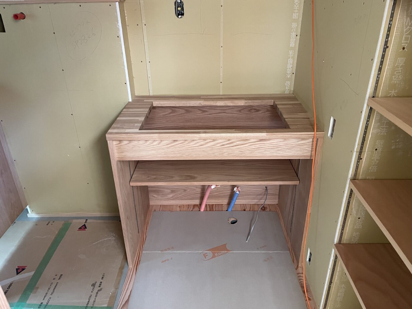 背面カウンターの天板はホワイトオークの巾ハギ材を使用。