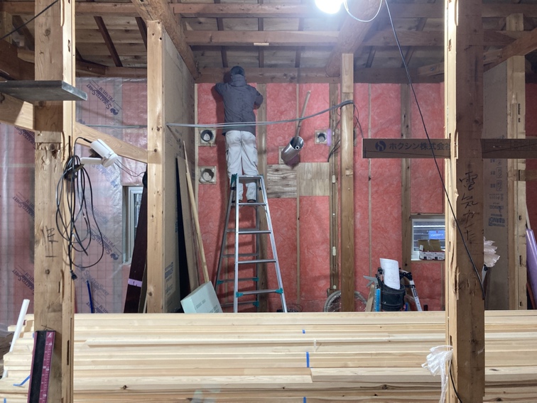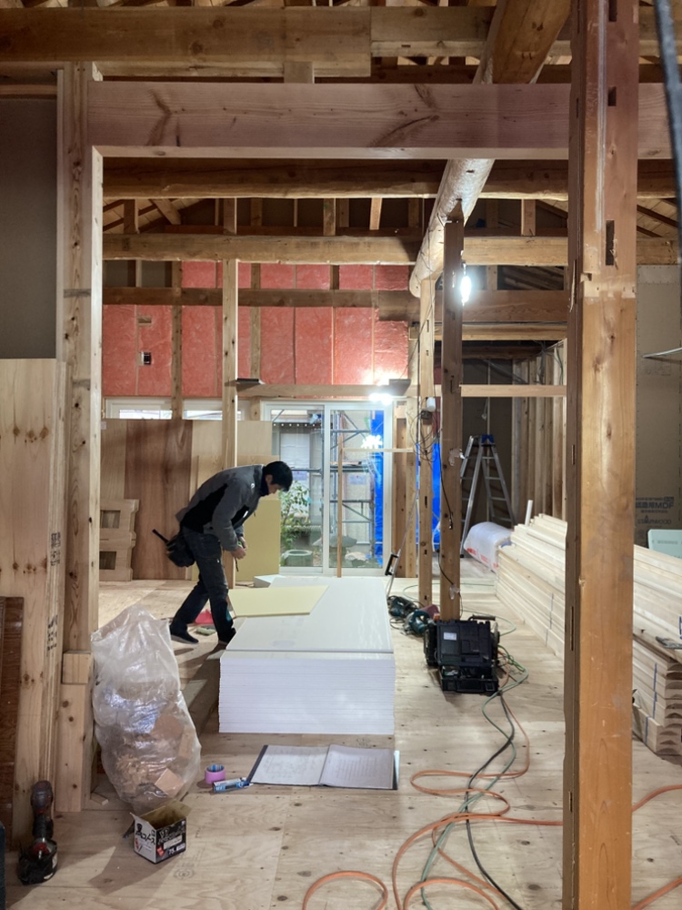 「白山浦のリノベーション」内部柱間断熱と気密 2026.03.12 ゲンバLIVE! 刈谷 裕樹 「白山浦のリノベーション」では、床組みが終わり、内部柱間断熱と気密処理が進んでいます。 4寸柱なので、いつもより断熱材も厚みがあります。 電気屋さんの配線もあらかた終わり、貫通部にもそれぞれ断熱気密処理を施しています。 現場監督 刈谷 裕樹 建築部 二級建築士 Xでシェア Facebookでシェア