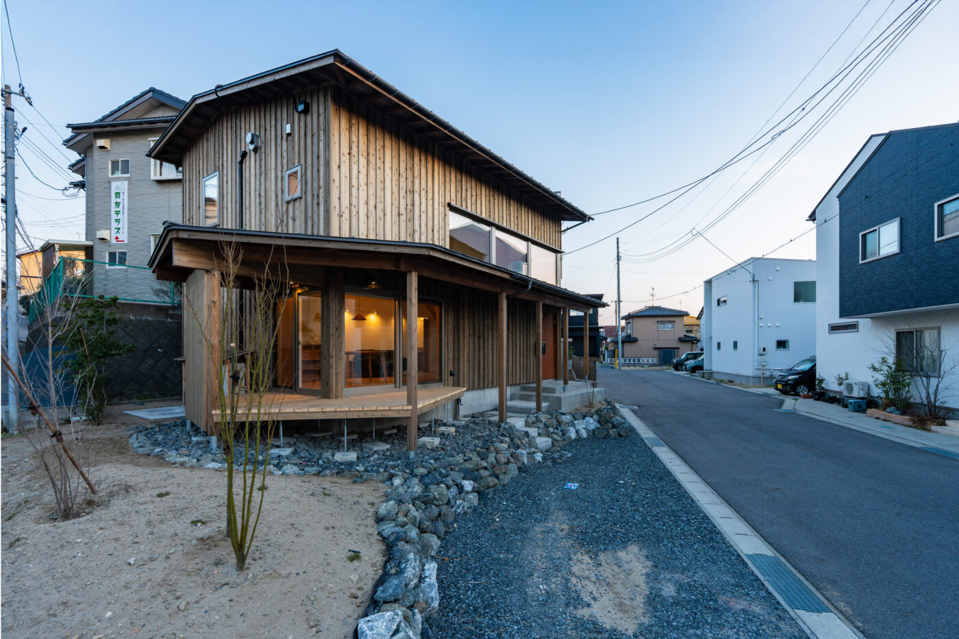 高さを抑えた建物と外壁の杉板横貼りで、比較的古い住宅街の中にあっても違和感なく溶け込んでいる。