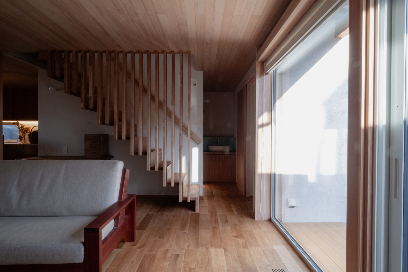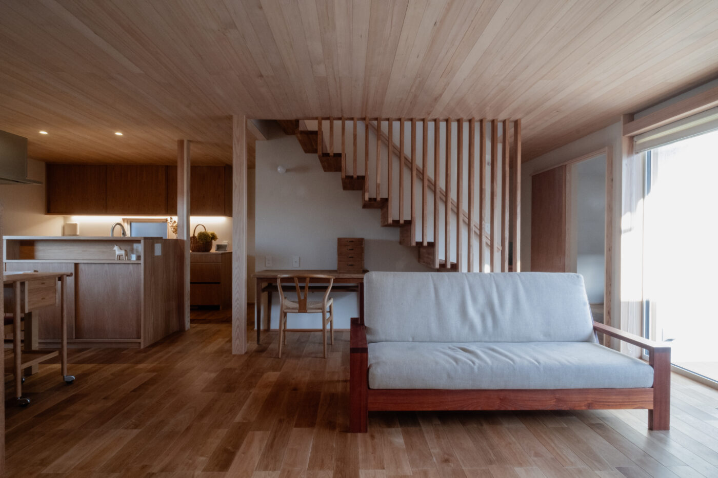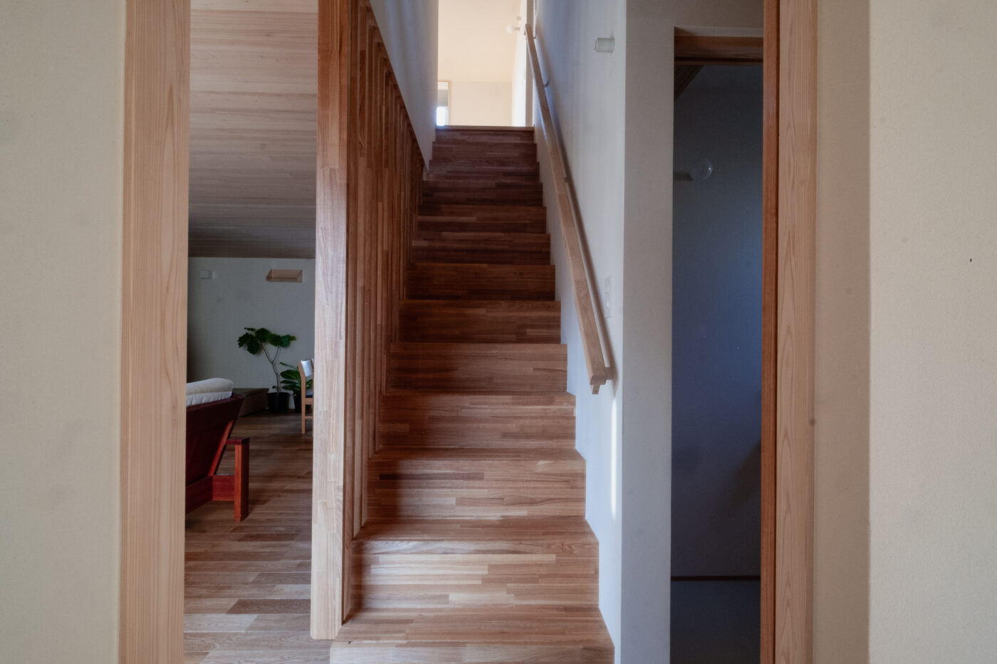 リビングのアクセントとなる階段は、圧迫感を抑えながら安定感のある格子壁でデザインしました。