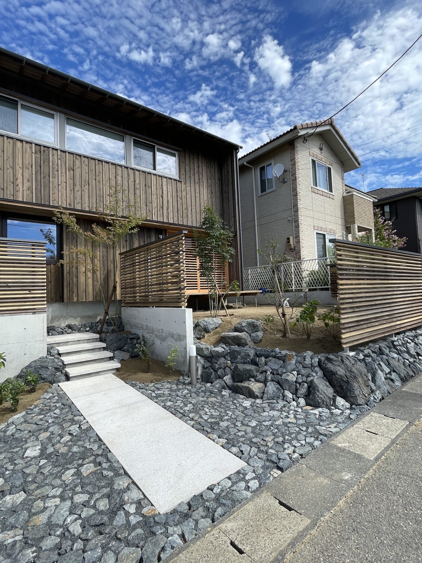 アプローチの段差が住まいへの期待感を高め、デッキから庭へと続く外構は、料理やキャンプが好きなご家族がBBQや家庭菜園など、屋外での楽しみを広げます。