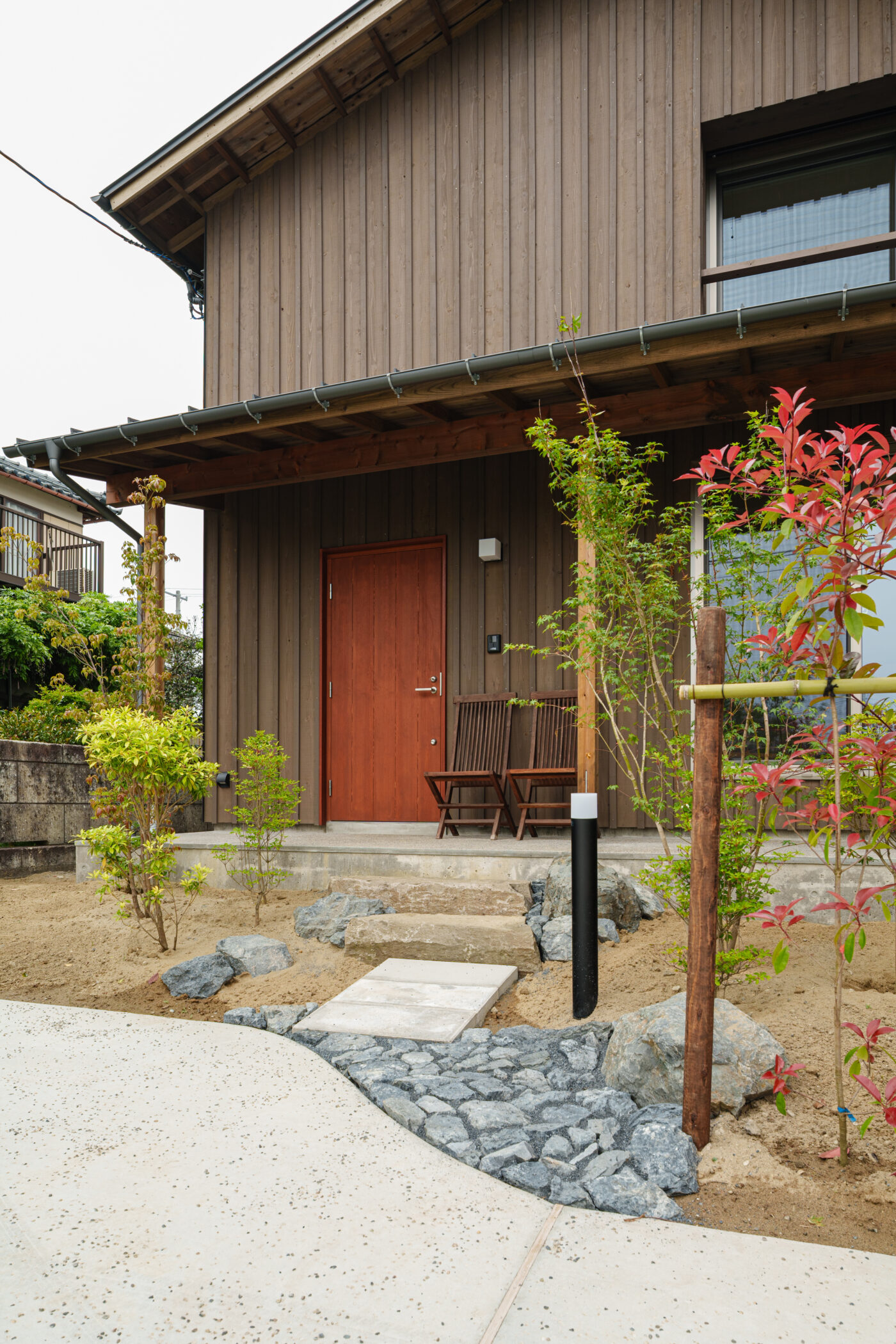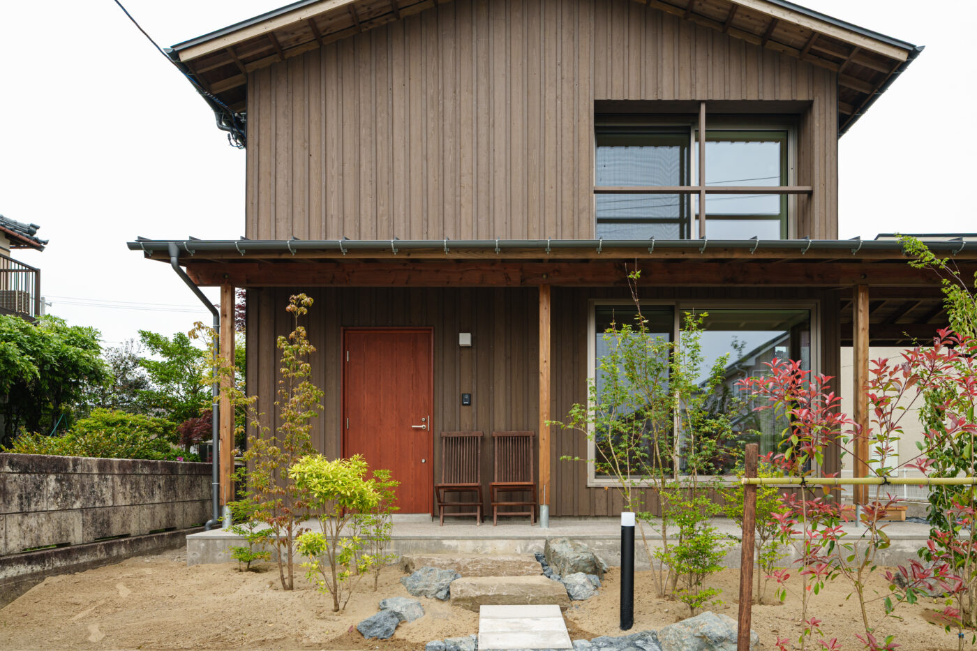 - 外観はシンメトリーの家型に下屋を添えた落ち着いた佇まい。