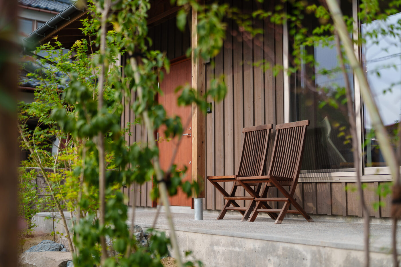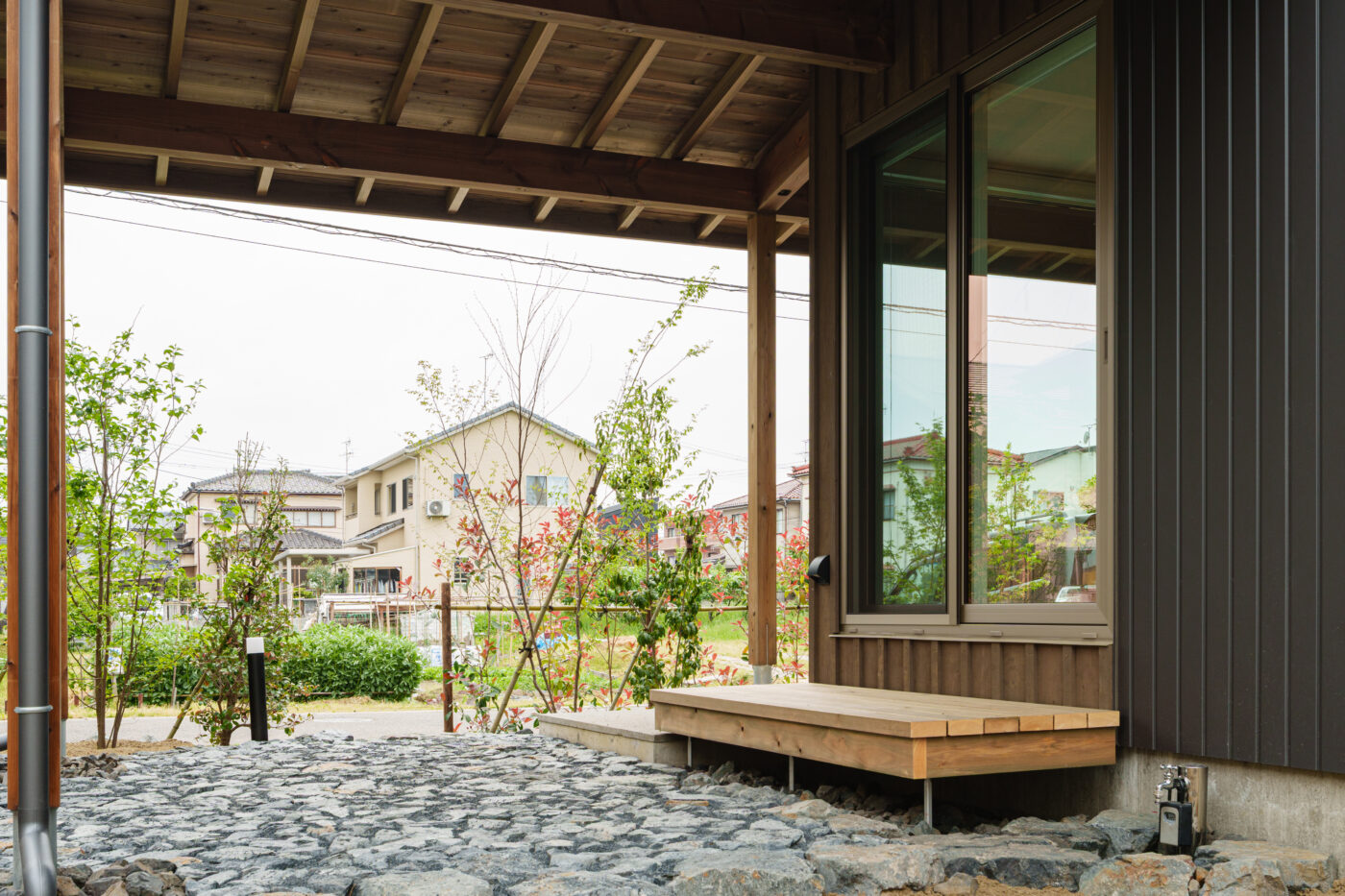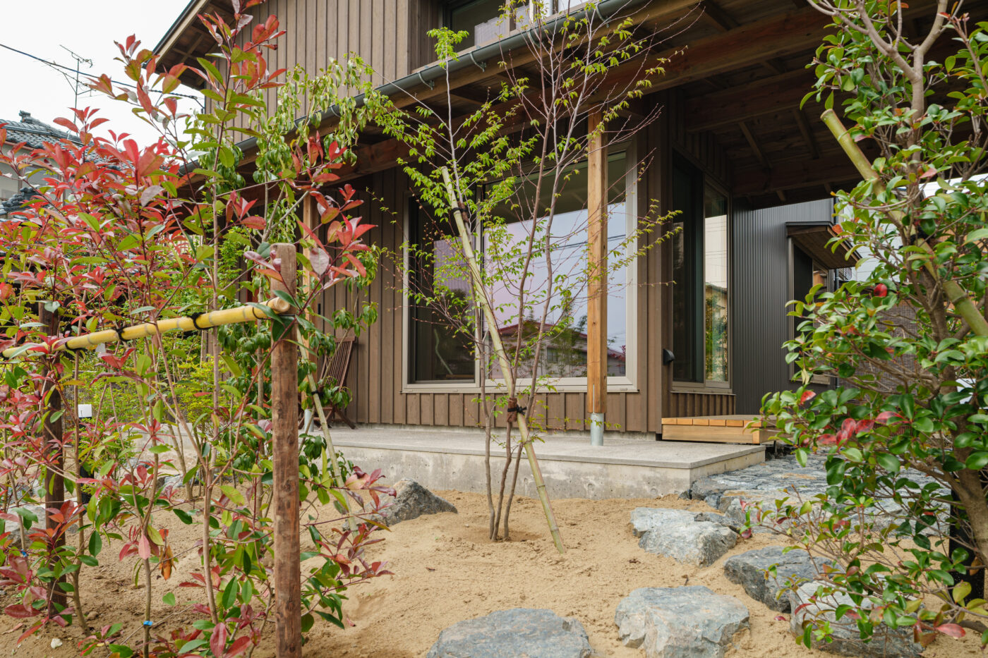 外壁はオーガニックスタジオ新潟オリジナルカラーの「オガスタグレー」を採用し、陰影が美しく街並みや庭の緑に静かに馴染みます。