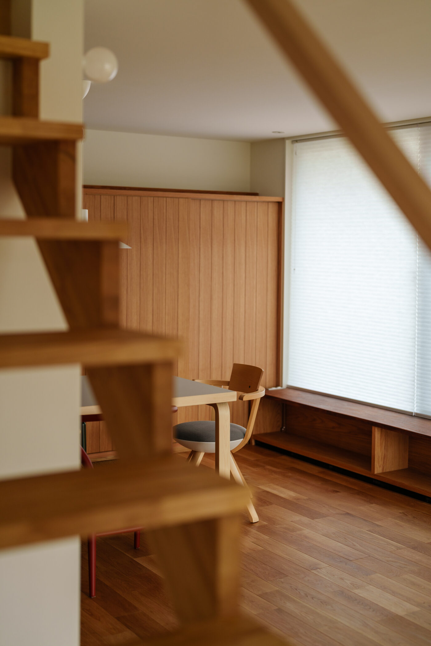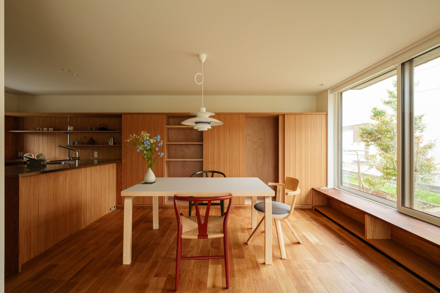 食堂南側の窓はベンチと一体化し、リビングのコーナー窓は西への視線を抜けさせることで、内外の一体感をつくります。