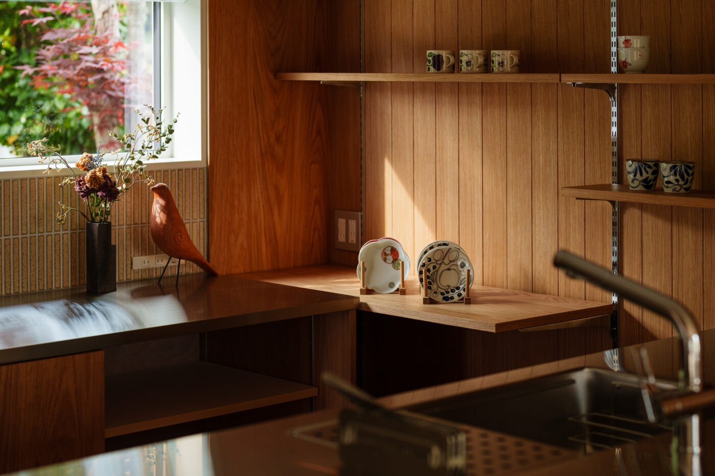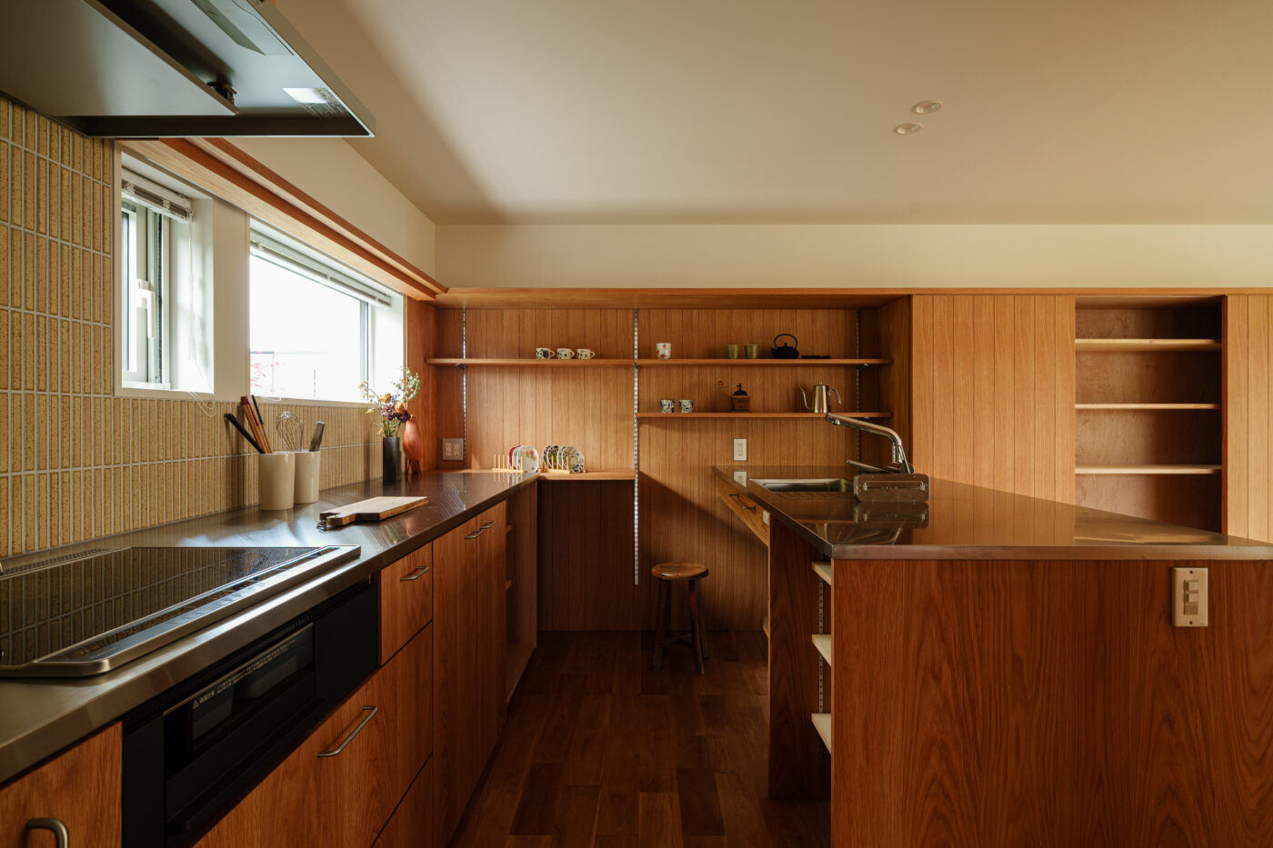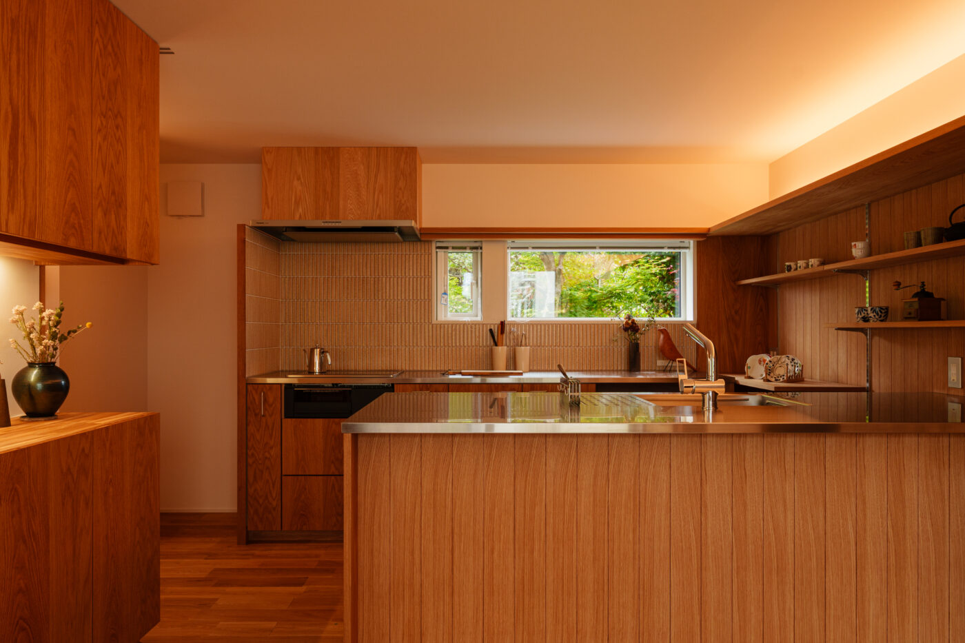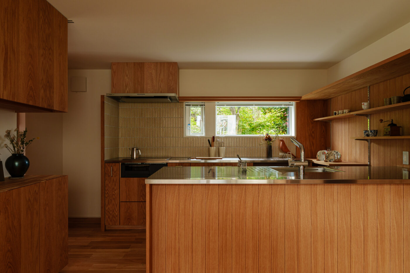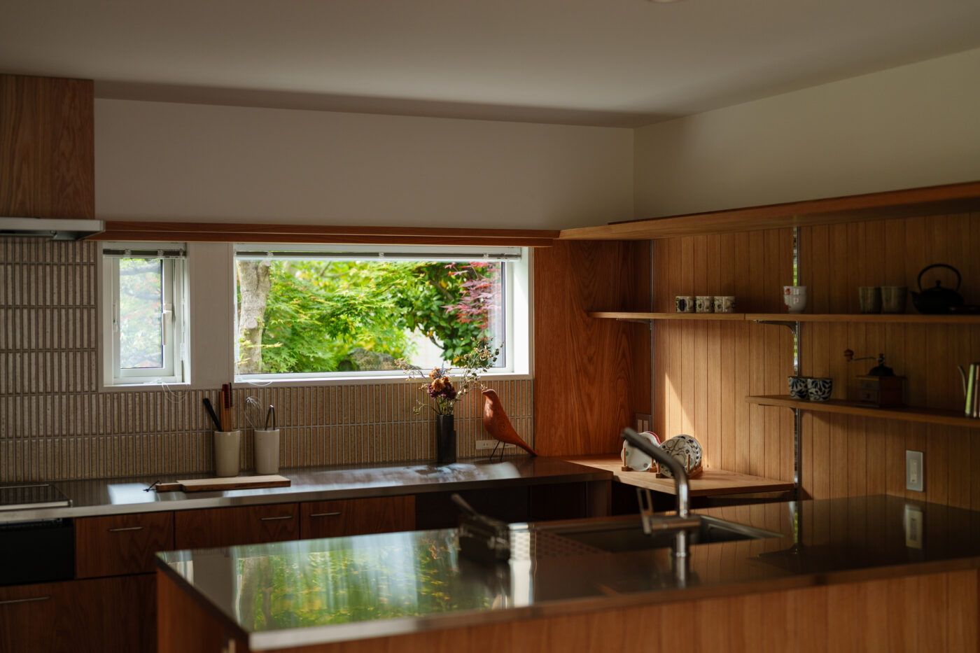 立つ位置に応じて異なる景色が楽しめる設計で、シンク側からは庭の植栽、コンロ側からは遠景や借景が望めます。