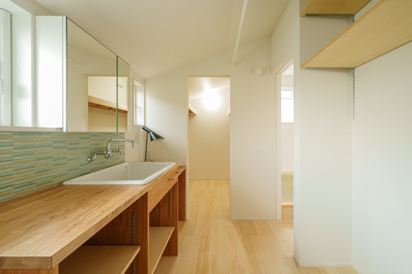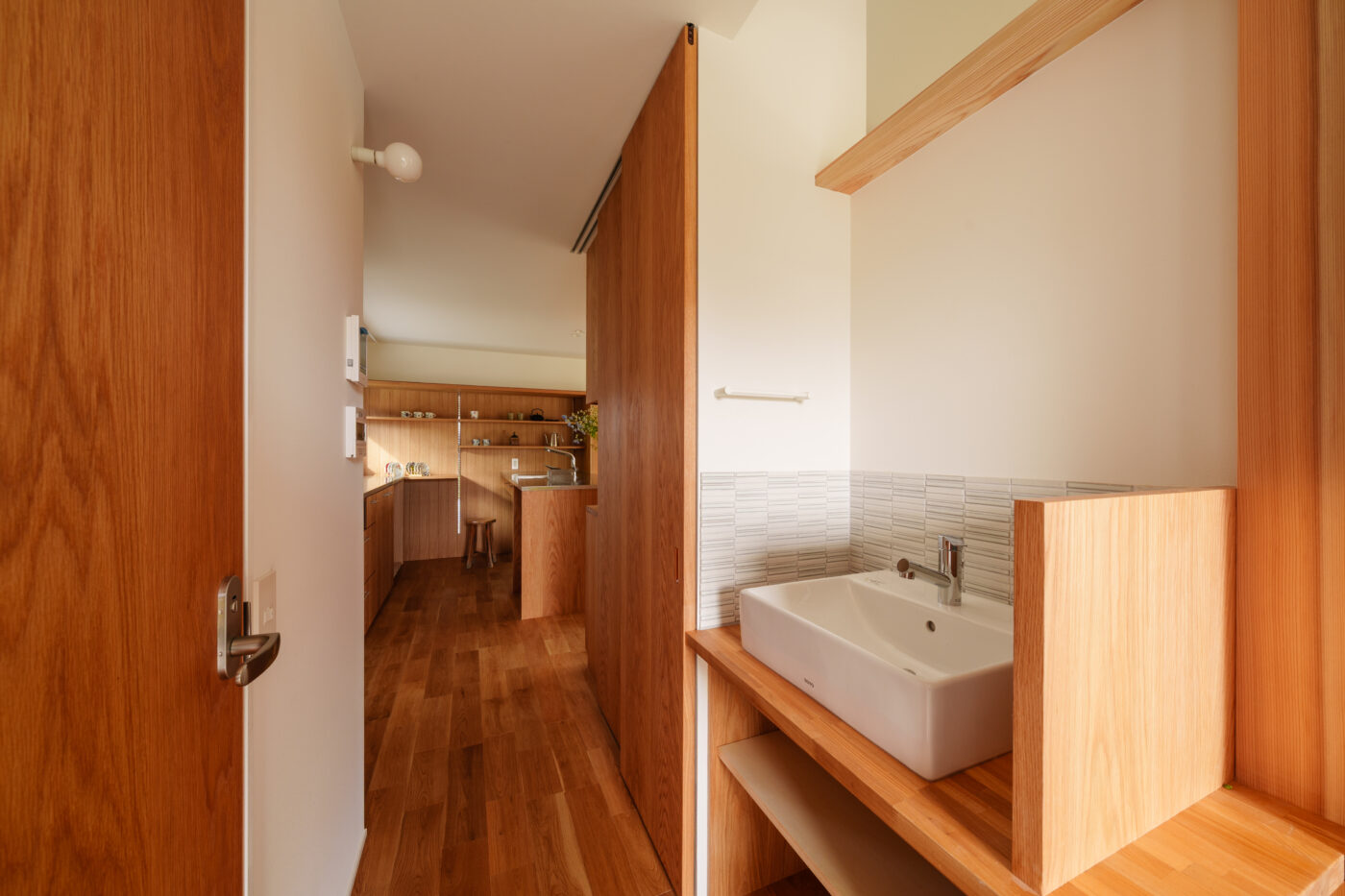 クローゼット・ランドリー・脱衣・浴室への回遊動線を設け、家事の流れがスムーズになるよう計画しました。