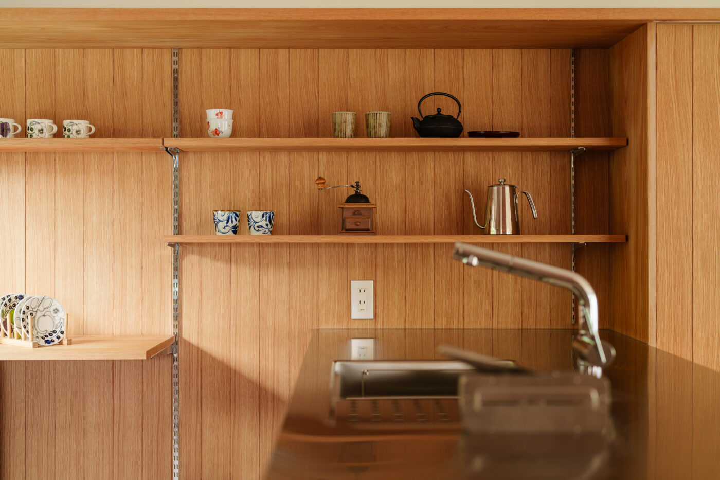 食品庫と連続する造作家具はキッチン側で食器棚としても機能。