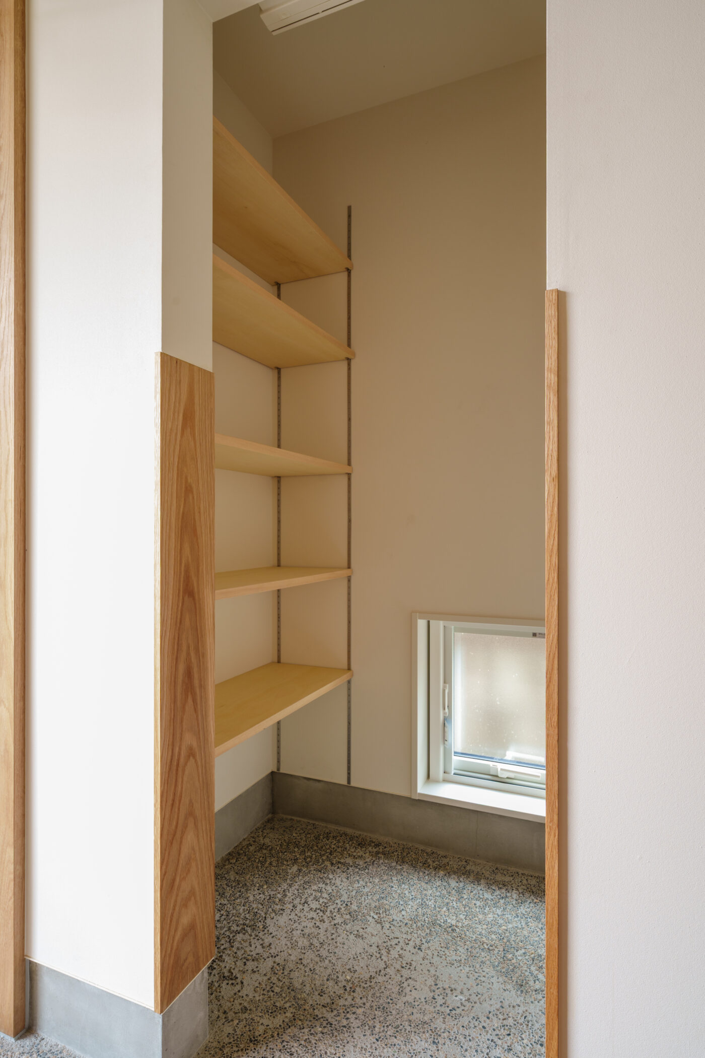 この家は“壁そのものを収納として機能させる”ことで、日用品や食品、趣味の道具までを自然に整理できるようにしています。