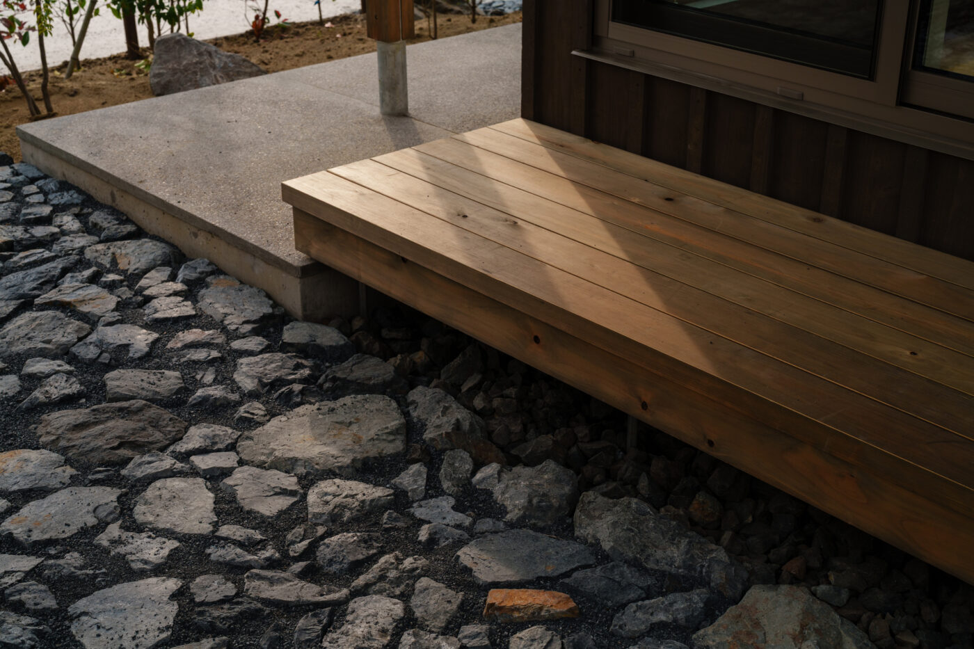 南に張り出すデッキは、植栽に囲まれたセミプライベート空間として活用可能です。