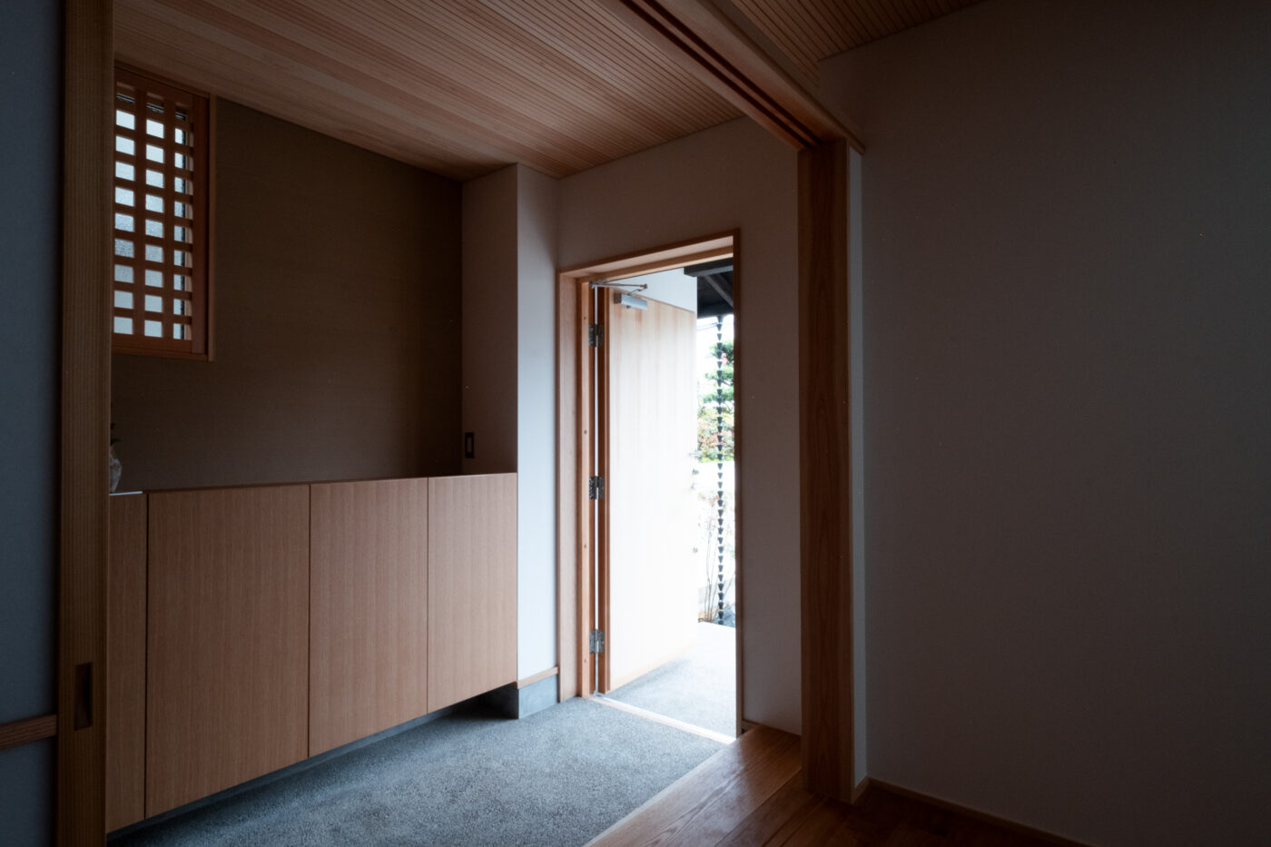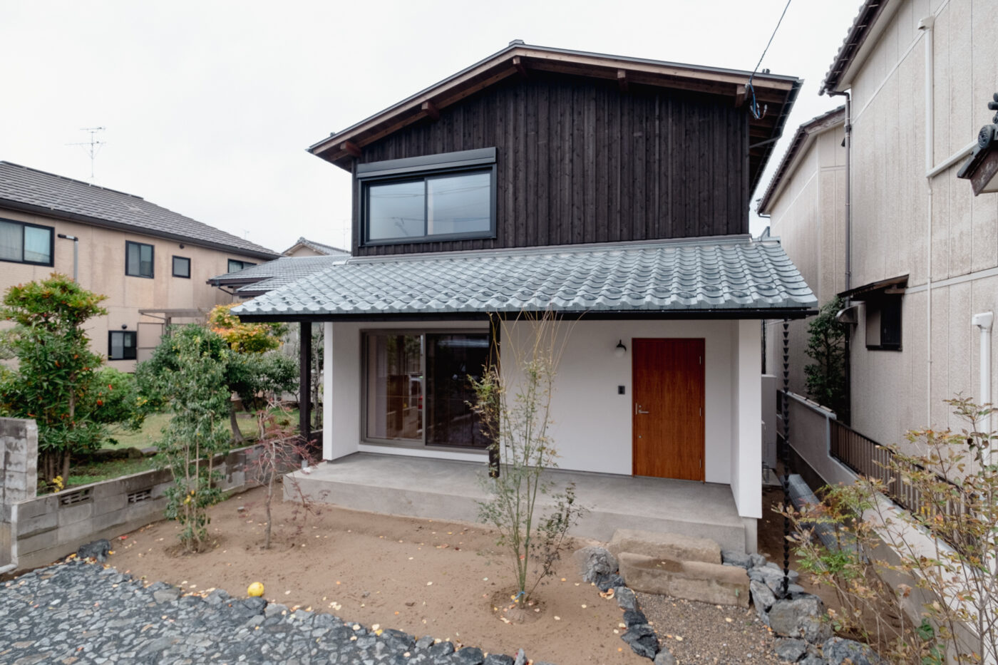 - ファサードはシンプルな切妻屋根で、玄関先を覆う深い下屋は一文字葺きの瓦屋根。