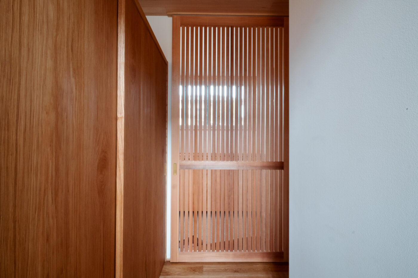 - 浴室はハーフユニットバスを採用し、天井と壁をヒノキで仕上げました。