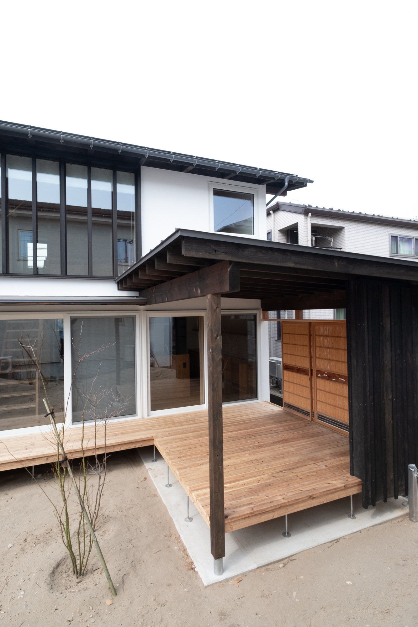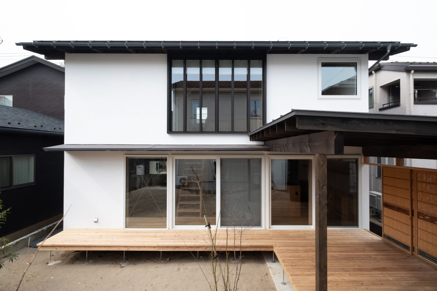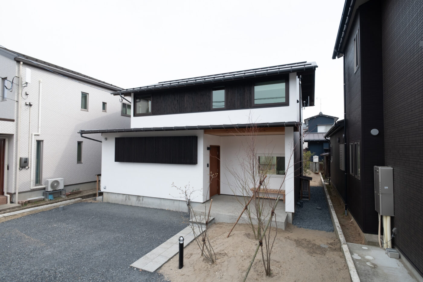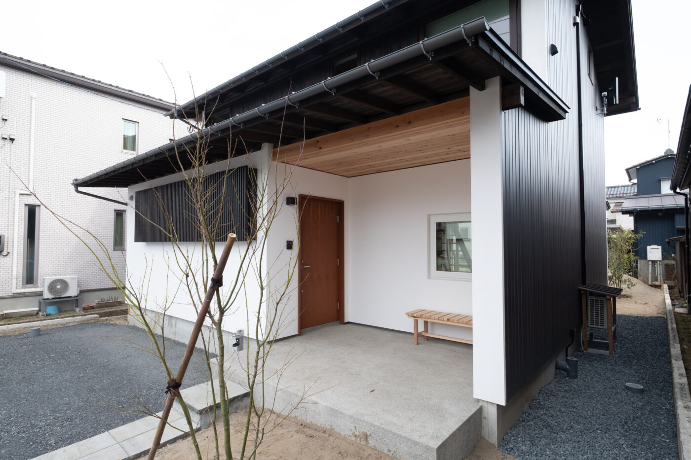 - 漆喰の白と黒塗装した杉板の外観は、端正で落ち着いたデザイン。