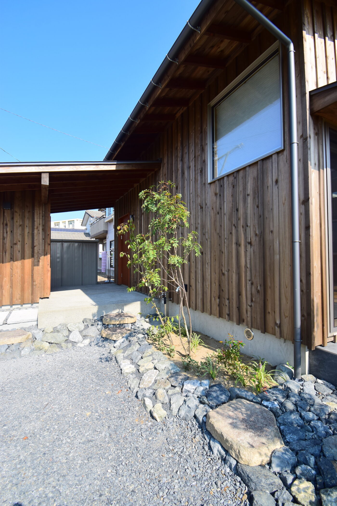 玄関前の外物置の屋根を母屋の屋根より一段下げて伸ばし、低い屋根に守られるポーチとしている。